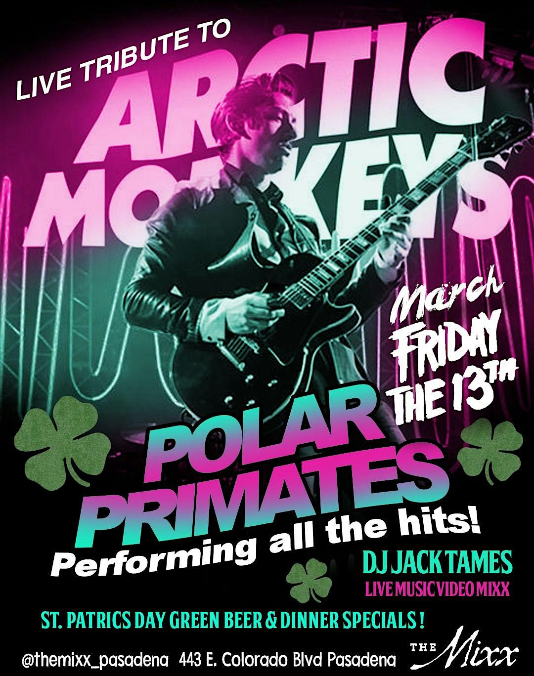 Get Lucky this Friday the 13th with GREEN BEER and Live Music as we ceebrate St. Pattys Day, featuring a live tribute to The Arctic Monkeys by local rockers POLAR PRIMATES.