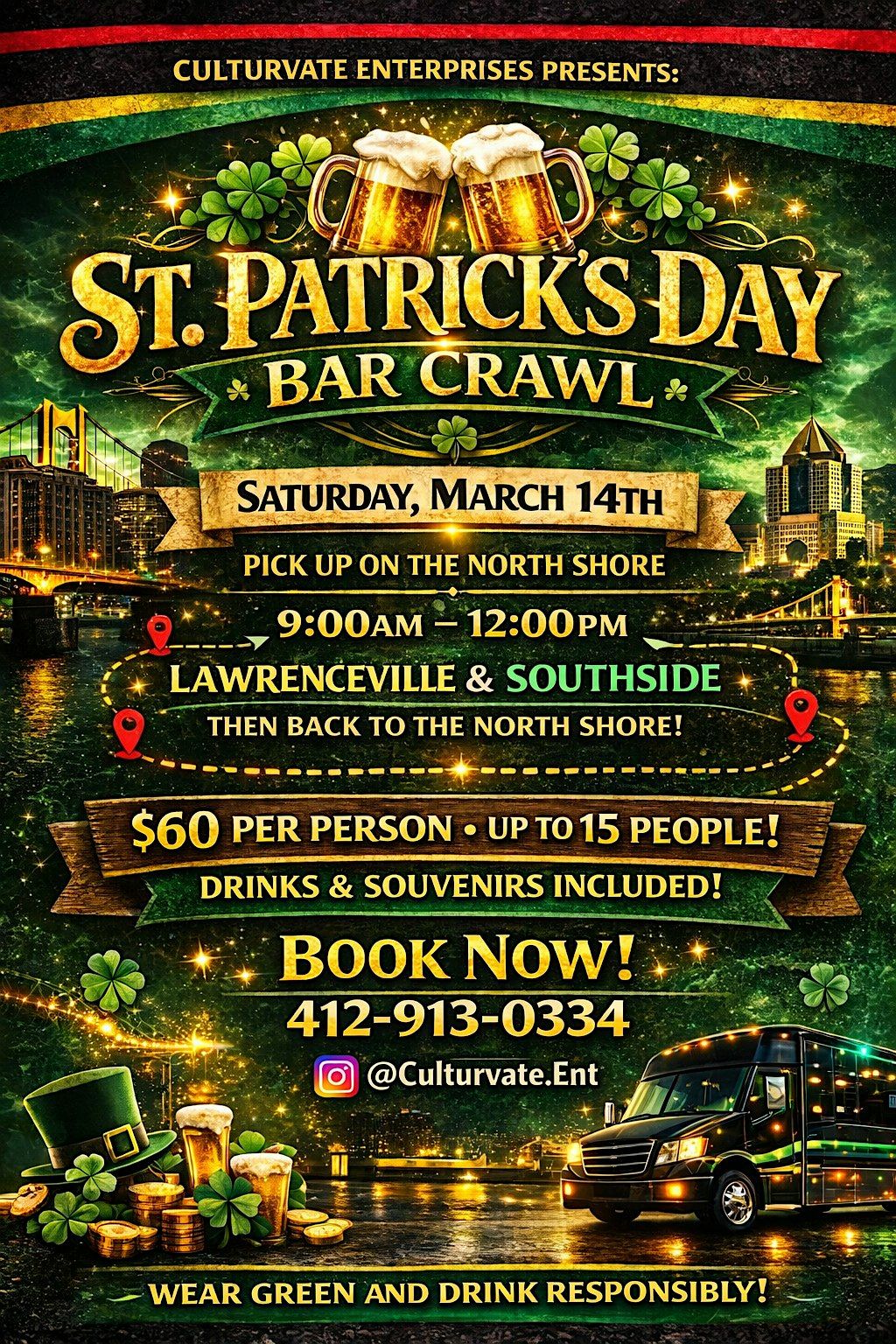 Join Culturvate Enterprises for a curated bar crawl experience through some of Pittsburgh’s favorite neighborhoods. We’ll start and end on the North Shore, with stops in Lawrenceville and the South Side, all while riding together in style.