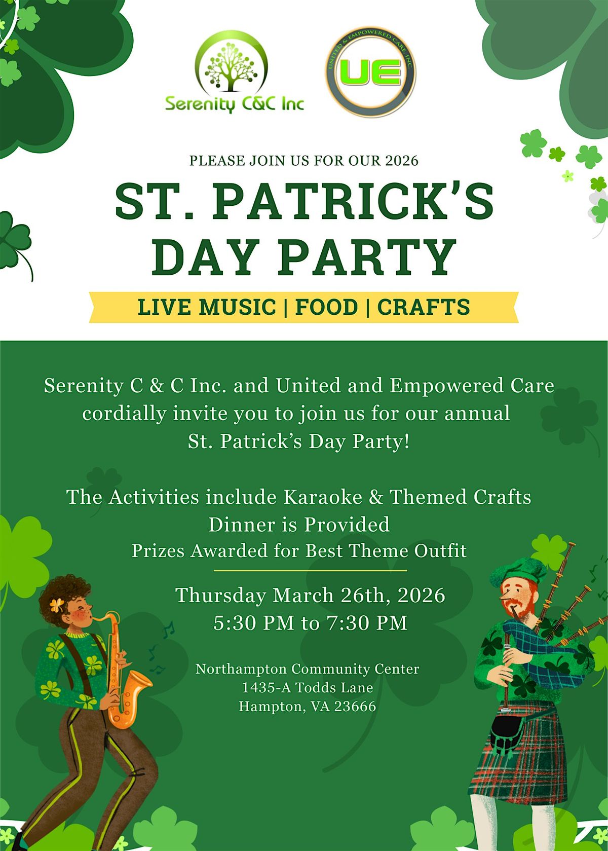 Serenity C & C Inc. and United and Empowered Care cordially invite you to join us for our annual St. Patrick’s Day Party!