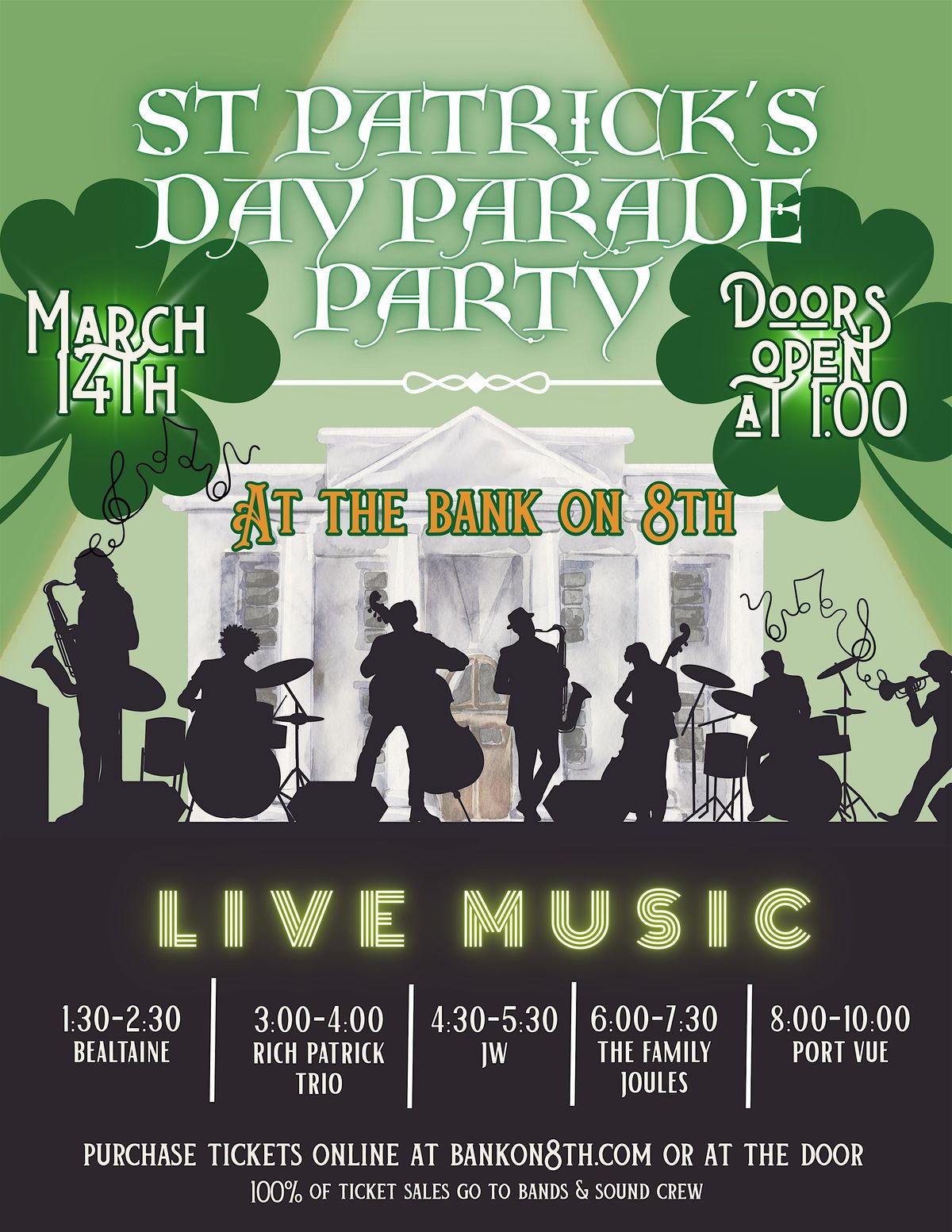 Our annual St. Patrick's Parade Day party will be held March 14. Doors open at 1pm. Stop by after the parade for live music. Food and Drink will be available for purchase. 21+ event