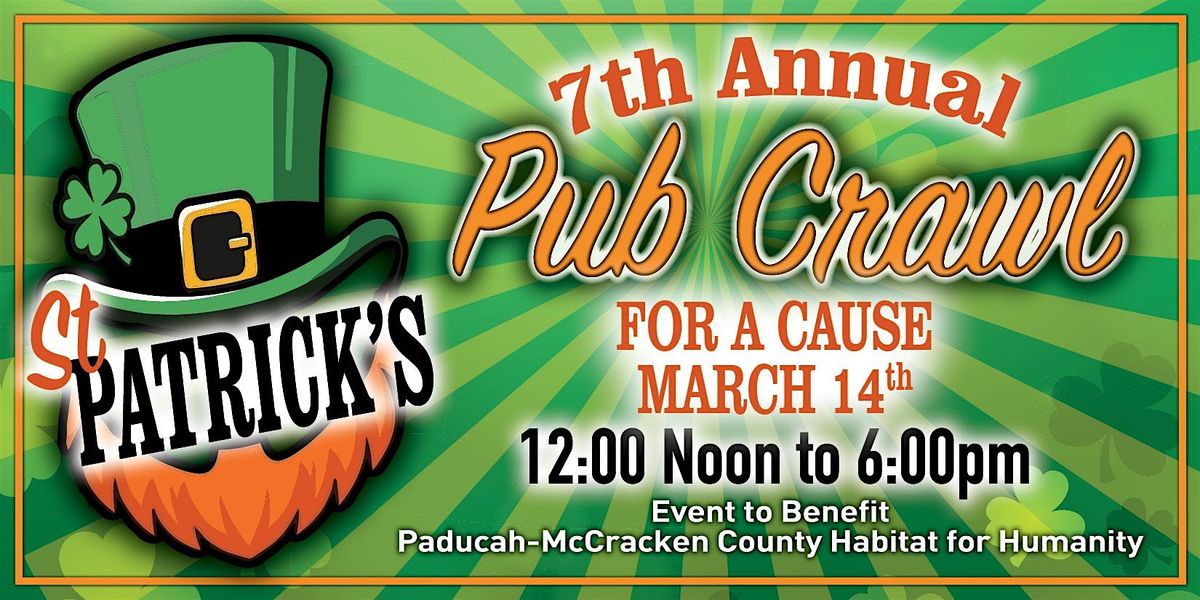 Come celebrate the 7th Annual St. Patrick’s Day Pub Crawl for a Cause on Saturday, March 14th from 12:00pm -6:00pm for the benefit of Paducah- McCracken Habitat for Humanity. Registration table will be set up Downtown! This event's wristband purchase will give you 2 tabs to be pulled off and used at any establishment on the crawl for Crawler Menu ONLY! Access to Crawler Only Menu of discounted drink and food menu specials! Several spots with plenty of vivacious energy for a lively St. Patrick’s Day!!