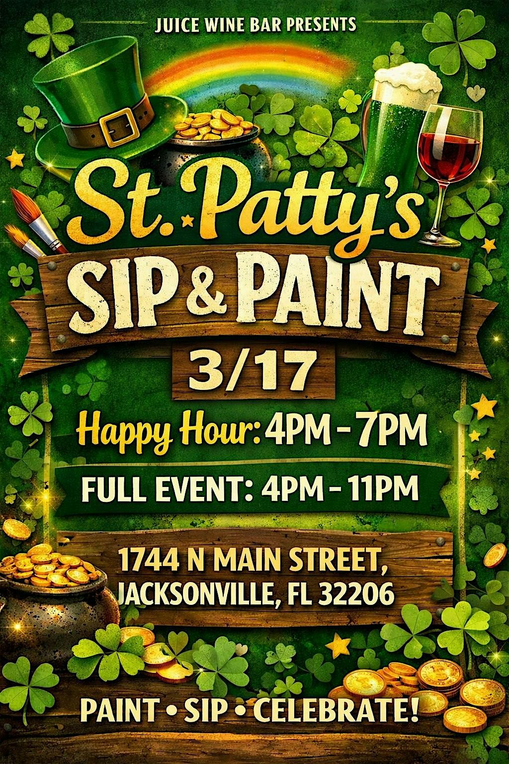 Celebrate St. Patrick's Day with a Sip & Paint experience like no other! Join us for an evening of creativity, cocktails, and great vibes at Juice Wine Bar in Springfield. Enjoy happy hour from 4PM-7PM and stay for the full event from 4PM-11PM. Grab your friends and let's paint, sip and celebrate!