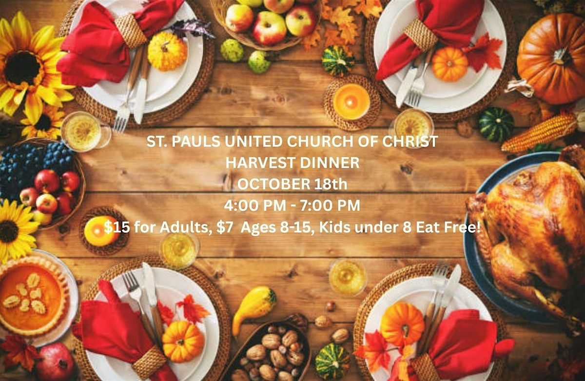 Come join us for a delicious Harvest Dinner at St. Pauls United Church of Christ, located at N89W16856 Appleton Ave! Indulge in a variety of seasonal dishes and dessert. This in-person event is a great opportunity to connect with the community and enjoy a warm meal together. Bring your family and friends for good food and fellowship. We can't wait to see you there!