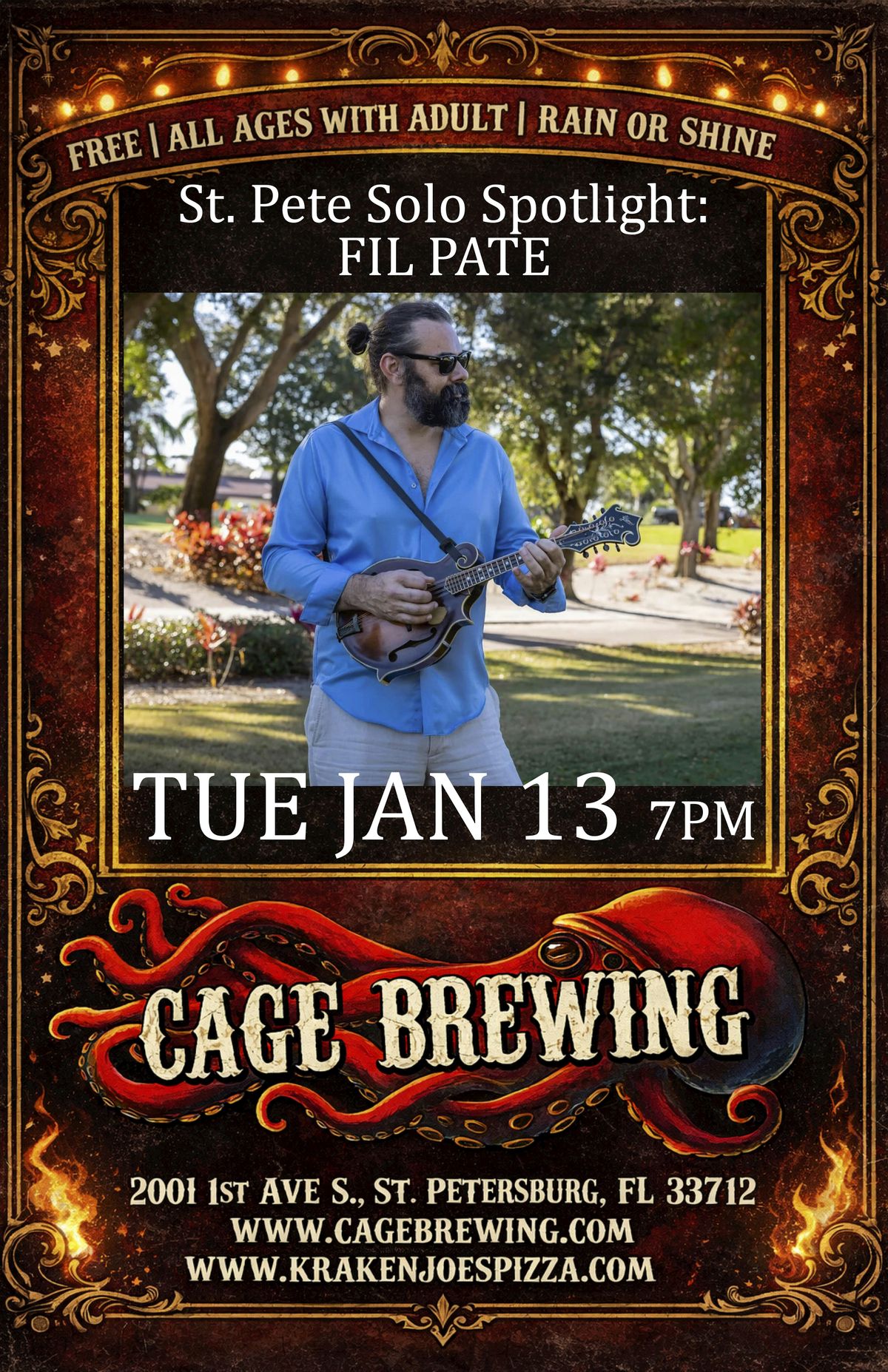 Come join us for a night of music with Fil Pate of the Fil Pate Trio at Cage Brewing! Get ready for an evening filled with great tunes and good vibes. This event is free entry, so bring your friends and let's have a blast together. See you there!