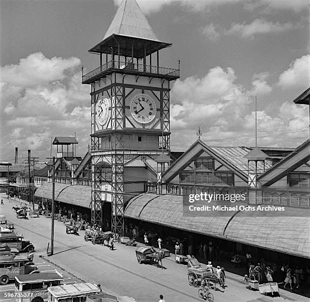 Stabroek Market’s History: Stabroek Market was officially established in its current location in Water Street in 1842 by Georgetown Town Council. It is evident, however, that the area had been used as a market many years before then. The market covers an area of about 80,000 square feet. The building, well known for its clock, is made from cast iron. Stabroek Market is a loud and busy place; always occupied with vendors, music, taxis, buses and even boats at the stelling. Everything imaginable is available for sale. As buyers walk around the market, stallholders call our their wares: "Bora! Cabbage! Pumpkin! Apple and Bananas! Corn! Whitey! Awara!" Some vendors walk around selling gum, mints, candy (sweety), biscuits, etc. Others walk around with baskets on their head selling pickled mangoes, pineapples, tangerines and more.