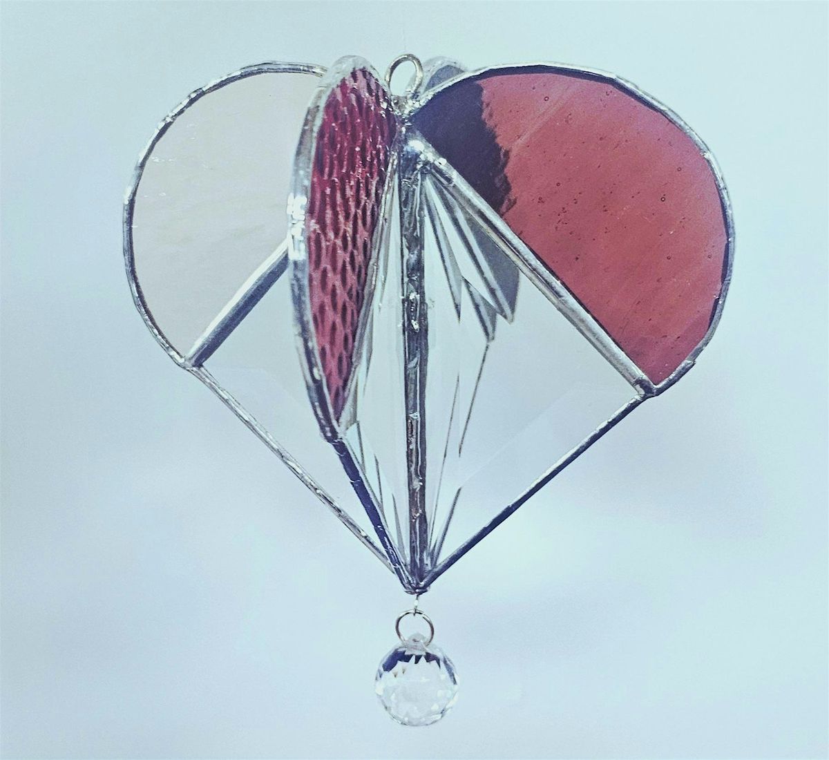 Choose and cut your own glass to complete your heart shaped glass spinner. The bevels are preshaped triangles and we will cut 4 semicircles to cap off our heart shapes. We will foil and solder our projects together and add an optional crystal to hang at the bottom.