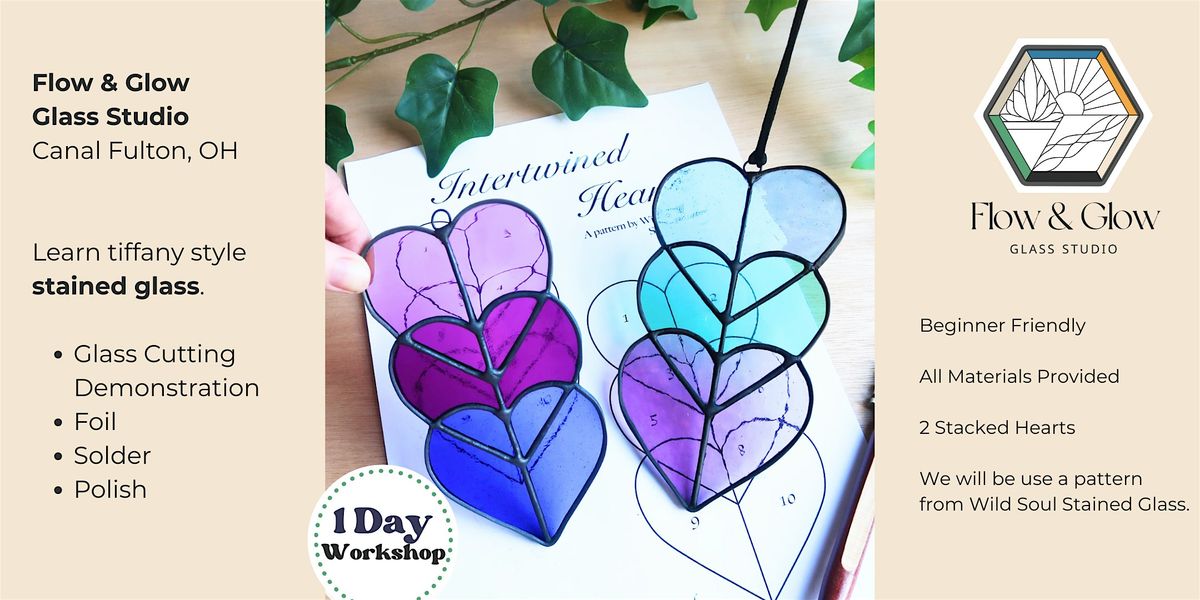 Hey there! Join us for a valentines fun and creative workshop where you'll learn how to make your very own stained glass intertwined hearts. We will use the tiffany style of stained glass learning to foil, solder, and polish. All glass pieces will be precut for this workshop. Connect with others inside Canal Creative at Flow and Glow Glass Studio and craft a beautiful piece to hang in your home or give as a thoughtful gift to a special person in your life.