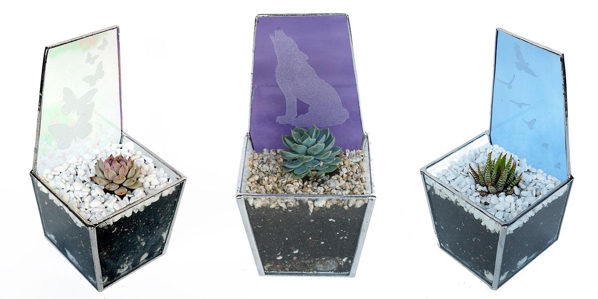 The back panel of the terrarium will be laser etched with either a stock pattern or a custom pattern of the student’s choosing. Students have a choice of what colour they want for the back glass panel as well. At the end of the course you will have a completed terrarium that is 4″ x 7″ x 3″.