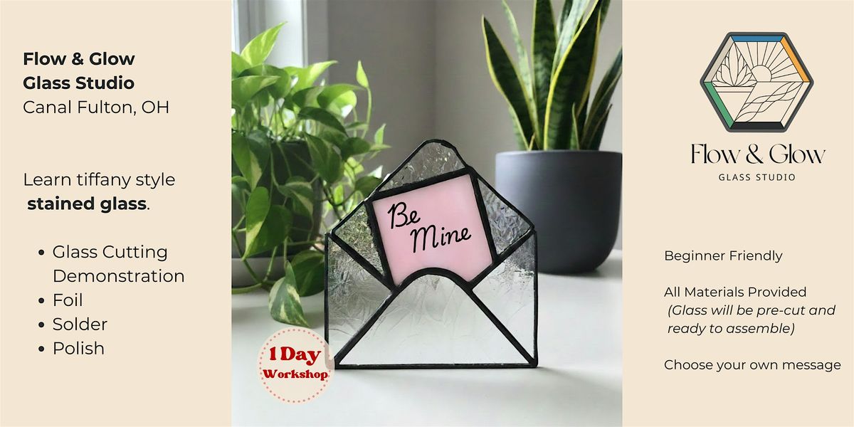 Hey there! Join us for a 1 night fun and creative workshop where you'll learn how to make your very own stained glass valentine. We will use the tiffany style of stained glass learning to cut one piece of the project, foil, solder, and polish. Connect with others inside Canal Creative at Flow and Glow Glass Studio and craft a beautiful piece to hang in your home or give as a thoughtful gift to a special person in your life.