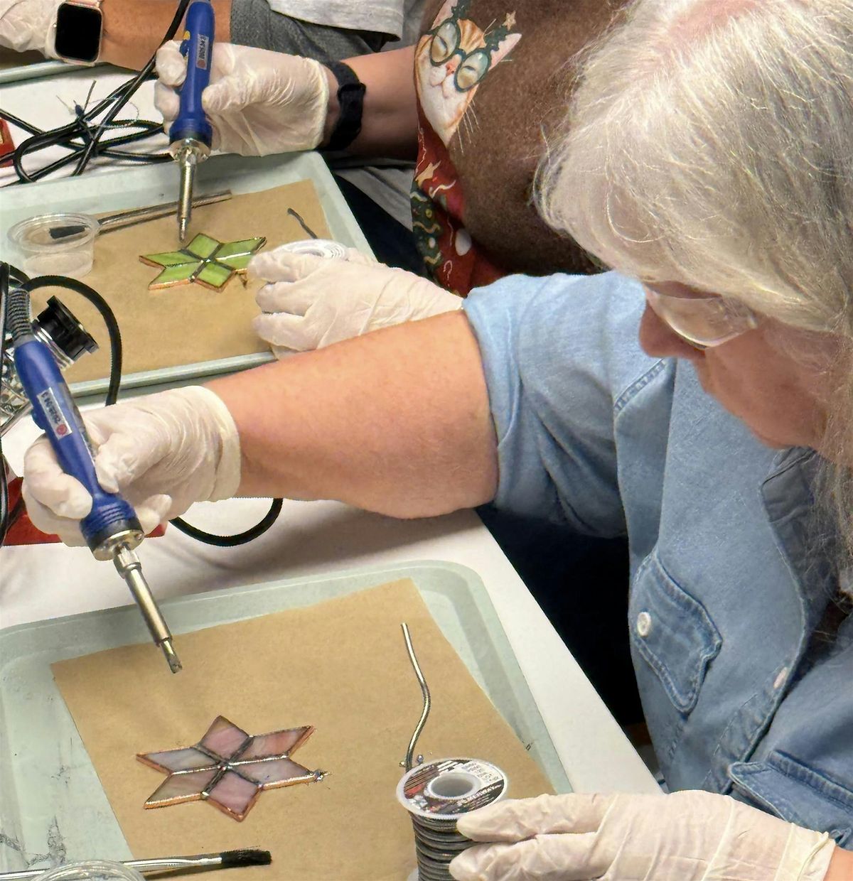 You'll wrap each piece of in copper foil before soldering them together. We'll cover flux application and proper soldering technique. By the end, you'll having a understanding of part of the stained glass process and leave with a finished piece.