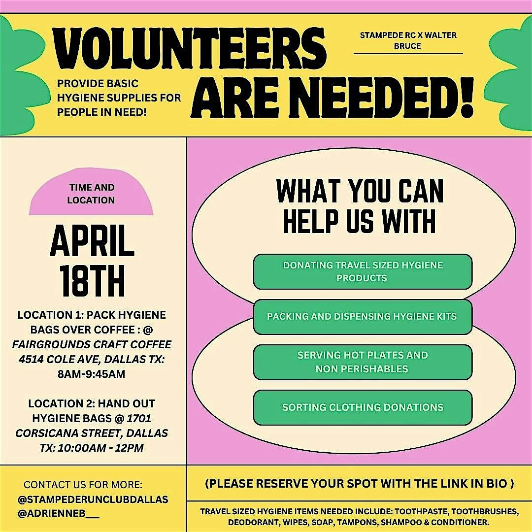 Provide basic Hygiene supplies for people in need! This event has TWO locations. Location 1 (8-10am) Location 2 (10-12).