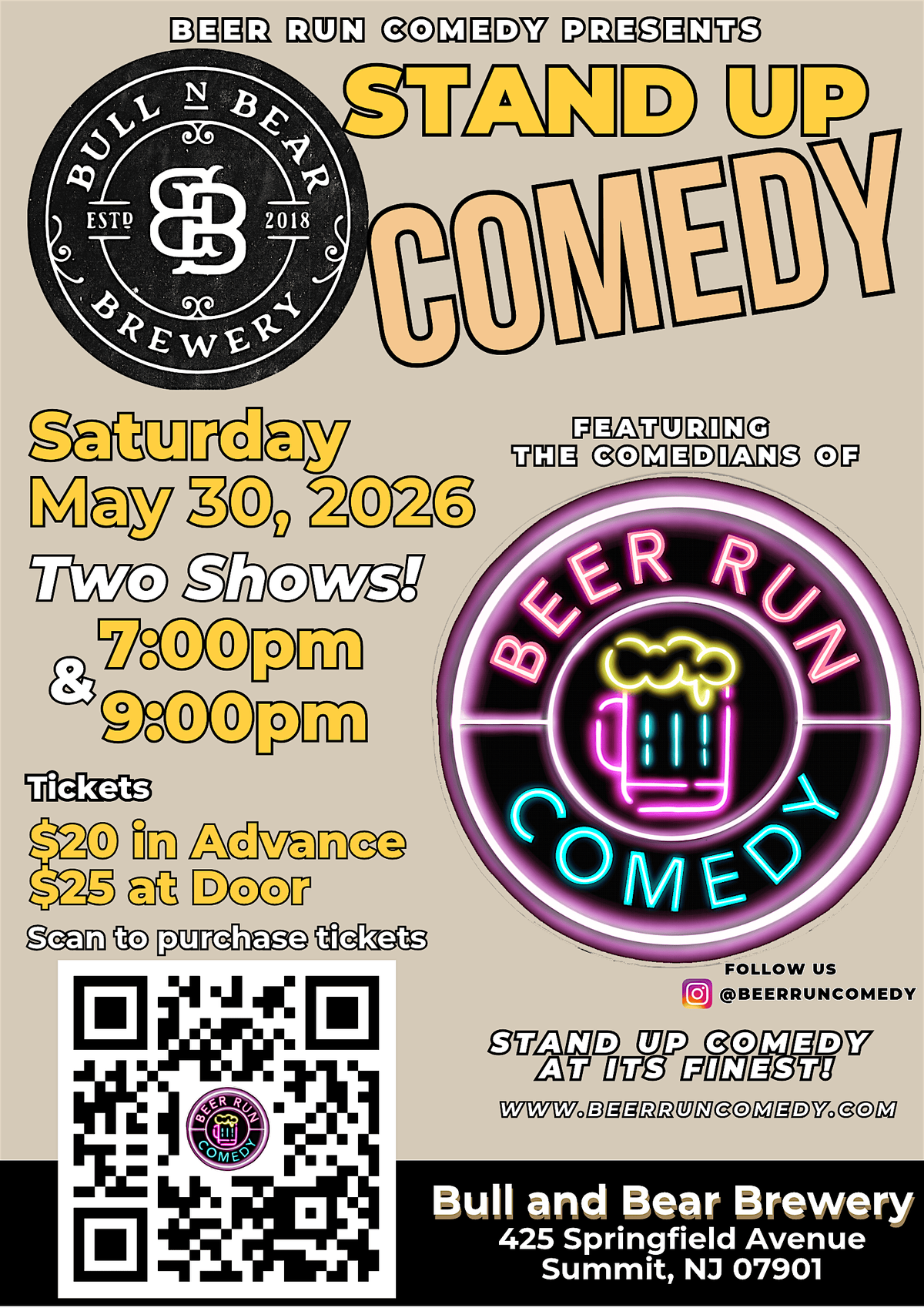 Beer Run Comedy, stand up comedy at its finest, presents their monthly series at Bull and Bear Brewery in Summit, NJ WITH TWO SHOWS (7:00pm and 9:00pm). Tickets are $20 online, and $25 at the door.