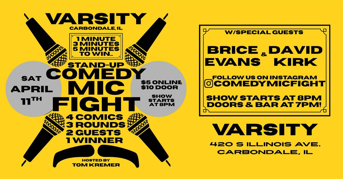 Get ready for a night full of laughs at The Varsity Carbondale! Join us on April 11, 2026 at 8:00 PM (Central) for an epic stand-up comedy mic fight where comedians battle it out to win your laughs. Whether you're a comedy fan or just looking for a fun night out, this event’s got you covered. Don't miss the chance to see Tom Kremer host this hilarious showdown live and in person! Doors and Bar at 7, the battle begins at 8!