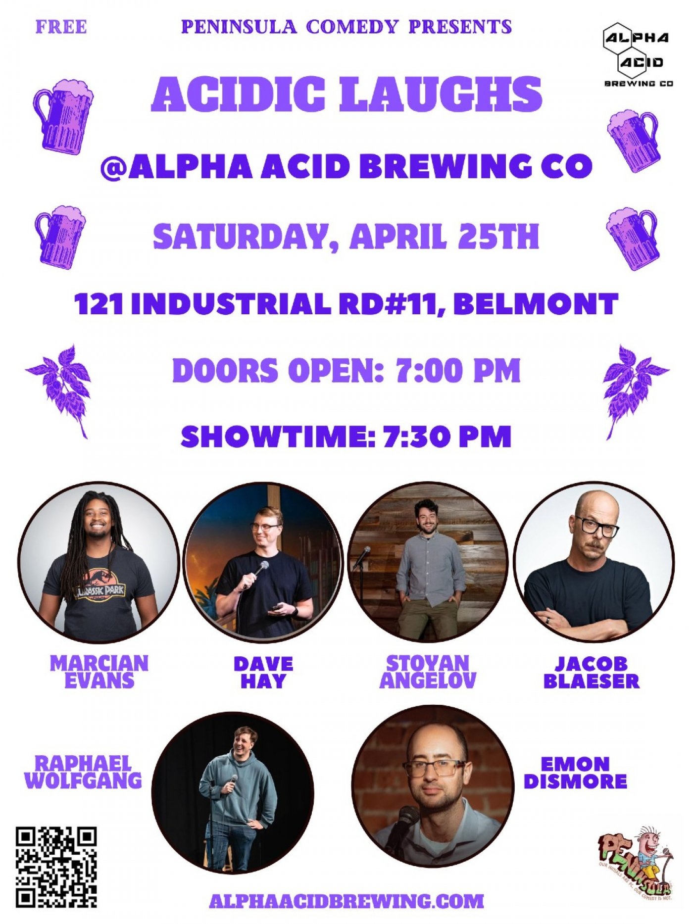 "Acidic Laughs @Alpha Acid Brewing Co" is the Newest and Hottest Comedy Show in the Peninsula. The Bubbly is pouring, the kegs are unloading, and the laughs are echoing through this very intimate space. Come down to Alpha Acid Brewing Co on Saturday, April 25th at 7:30 pm and enjoy award-winning beer while enjoying top local talent. We have comedians who are performing at all the local clubs such as; The San Francisco Punchline, Cobbs Comedy Club, and the San Jose Improv. A few of our comedians have even toured the country and have performed at some of the most prestigious venues like the "The Stand" in New York or the "Comedy Mothership" in Austin. If you have no plans, feel like doing something different, and are in the mood for laughing, this is the show for you!