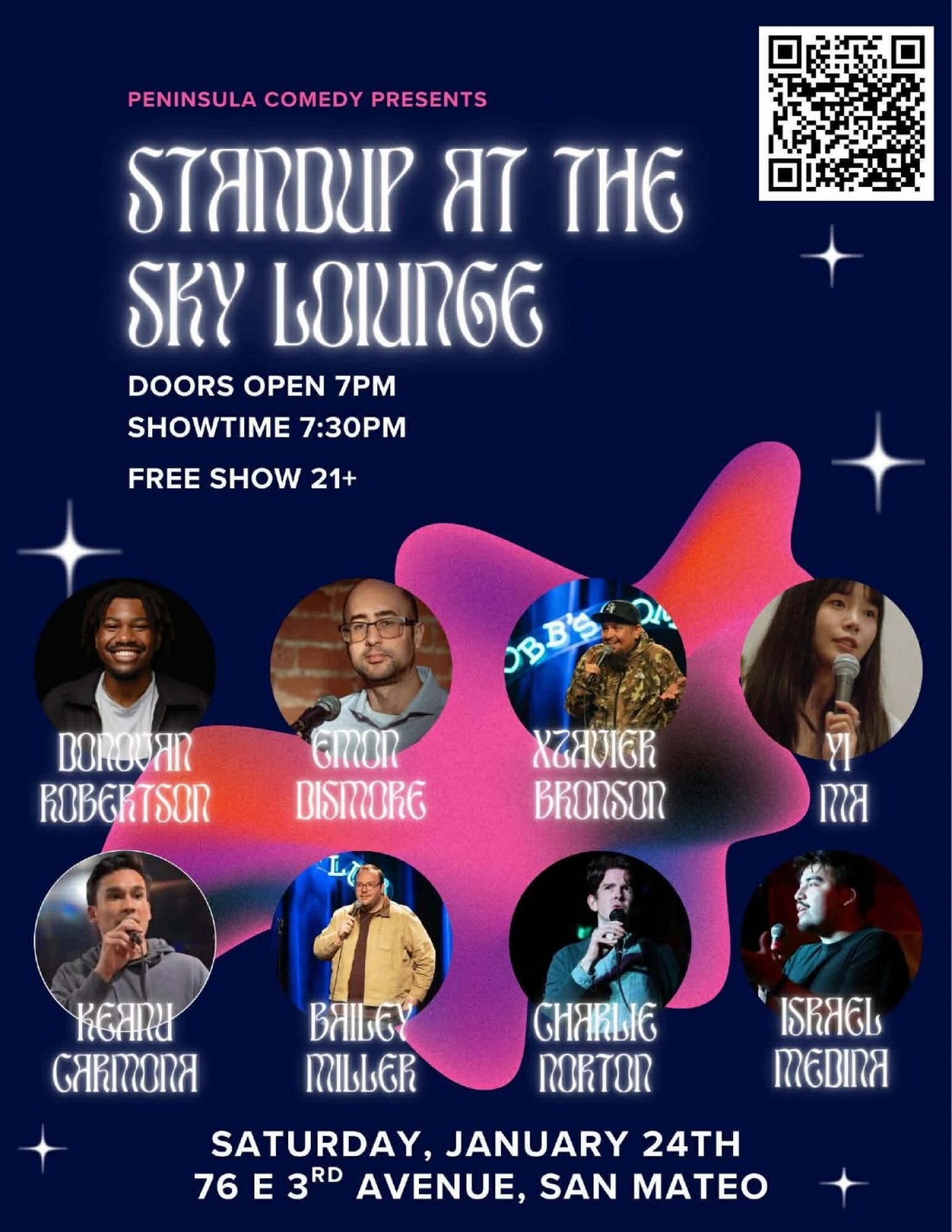 This comedy show is produced by Peninsula Comedy. Follow @peninsulacomedy or @emondismore if you're a fan of comedy and want to stay updated on future events. This show is happening on Saturday, January 24th from 7:30 pm to 9:30 pm. The feature comics on this lineup are Israel Medina (Peninsula Comedy),Donovan Robertson (Peninsula Comedy), Xzavier Bronson (San Jose Improv), Keanu Carmona (The Function), Charlie Norton (The Function), Bailey Miller (Cobbs Comedy Club), Yi Ma (HaHa Cafe), and our headliner is Emon Dismore (Peninsula Comedy).