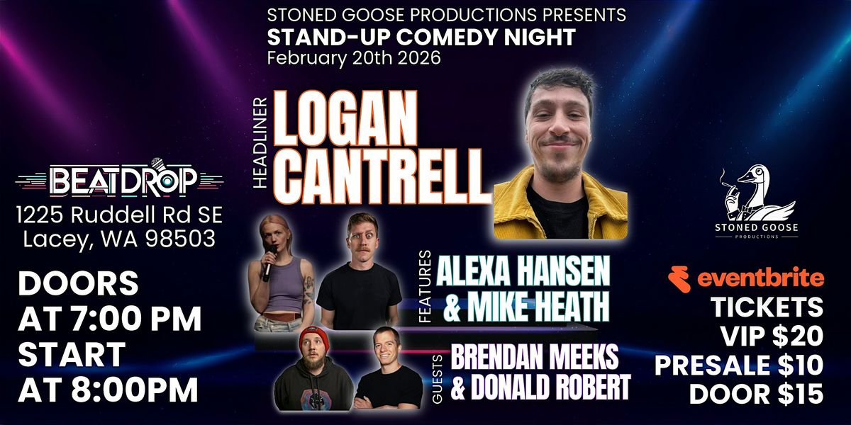 Stoned Goose Productions is taking over BeatDrop in Lacey, WA with a stacked stand-up lineup led by headliner Logan Cantrell. He’ll be joined by powerhouse features Alexa Hanson and Mike Heath, plus guests Brendan Meeks and Donald Robert, delivering a night of comedy that’s smart, strange, and completely unhinged in the best way.