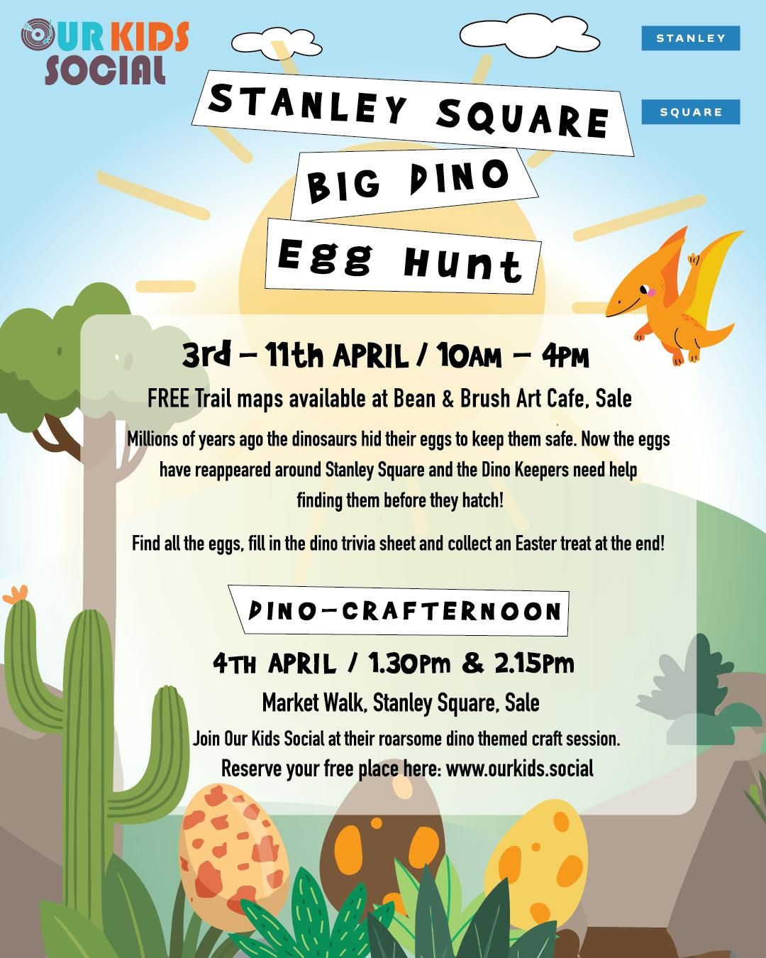 Get creative this Easter at Our Kids Social Dino themed craft sessions! Children will use paper and collage to create their own dinosaur with stencils, stickers and more! This event runs alongside the BIG dino egg hunt around the town too! FREE trail maps and Easter treats at the ends available from Bean & Brush Art Cafe in Stanley Square.
