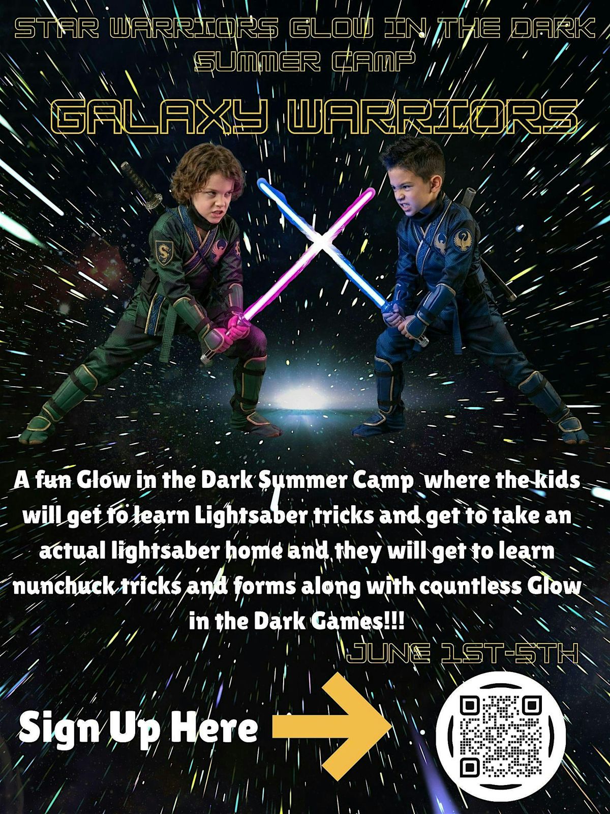 Dates: June 1st โ June 5th Step into a galaxy far, far away! ๐ This high-energy camp takes martial arts to the cosmic level. Students will train in a "glow-in-the-dark" environment, mastering epic lightsaber tricks and nunchuck forms. Camps are $199 for Monday-Friday 8 am - 4pm Campers bring water bottle and sack lunch. Pay a $50 deposit today and pay the rest the friday before Summer Camp Starts.