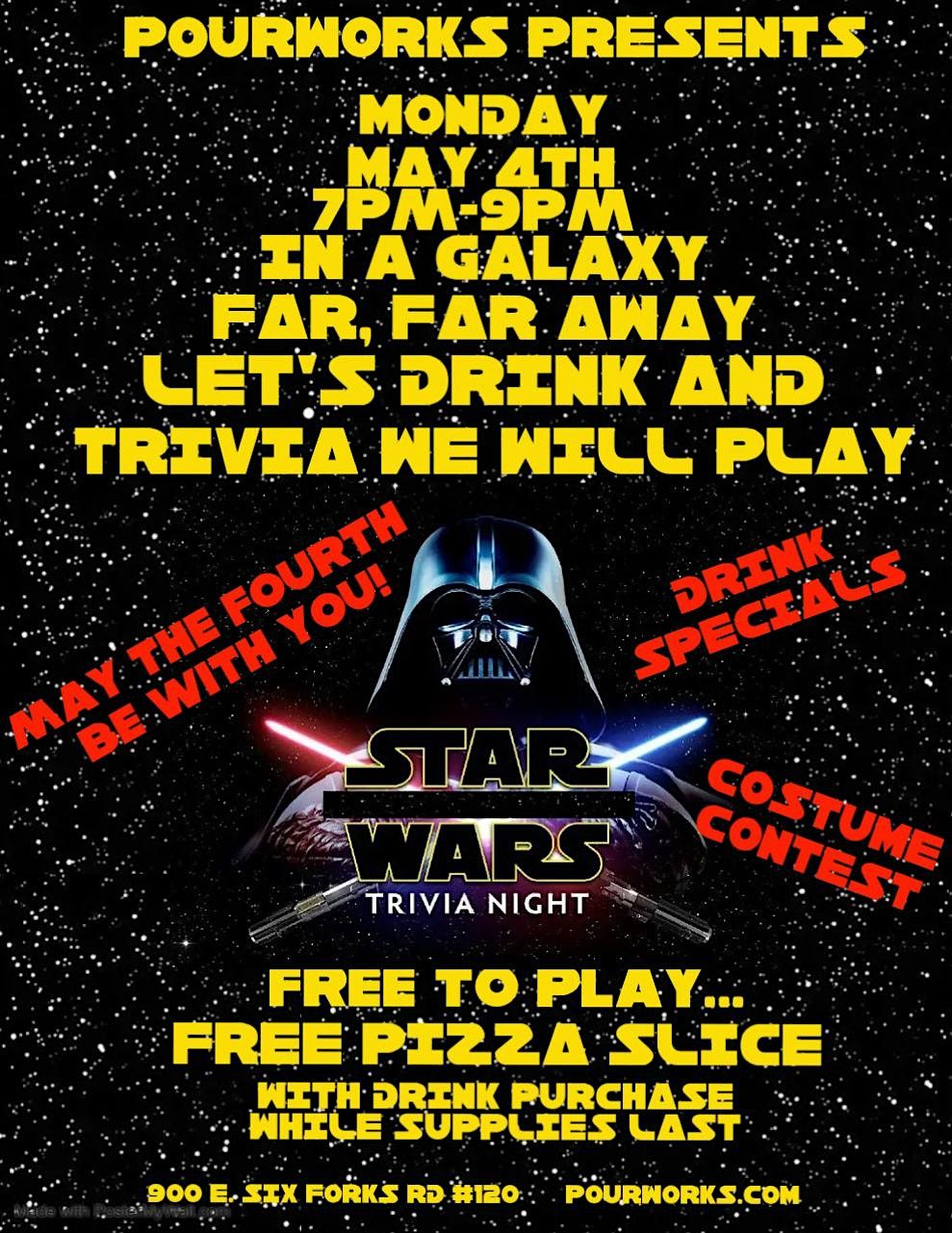 May the Fourth be with you...Join us for a very special Star Wars Trivia Night! Monday, May 4th from 7-9pm. FREE to play. Fun, prizes and FREE pizza slice with drink purchase while supplies last! Tell your friends and family, compete for prizes and bragging rights!