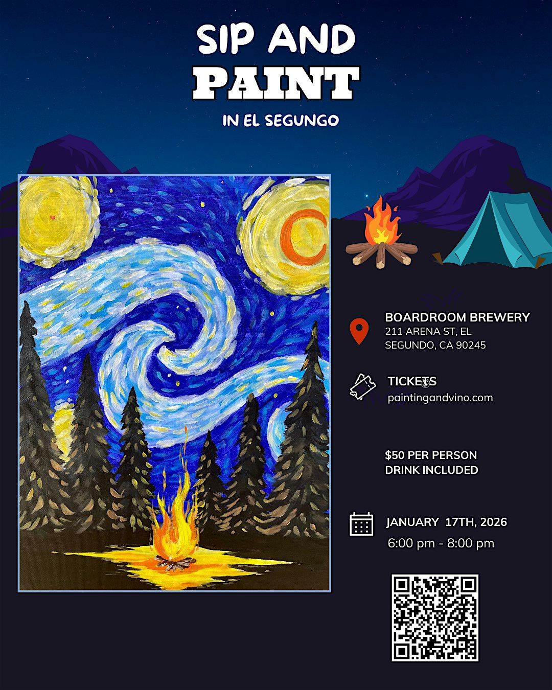 Looking for a creative night out? At this Starry Campfire Paint and Sip Night, you’ll indulge in a cozy evening of creativity and relaxation at venue, Boardroom Brewery and instructed by artist, Morgan Palla. The perfect cozy themed paint and pint night in El Segundo!