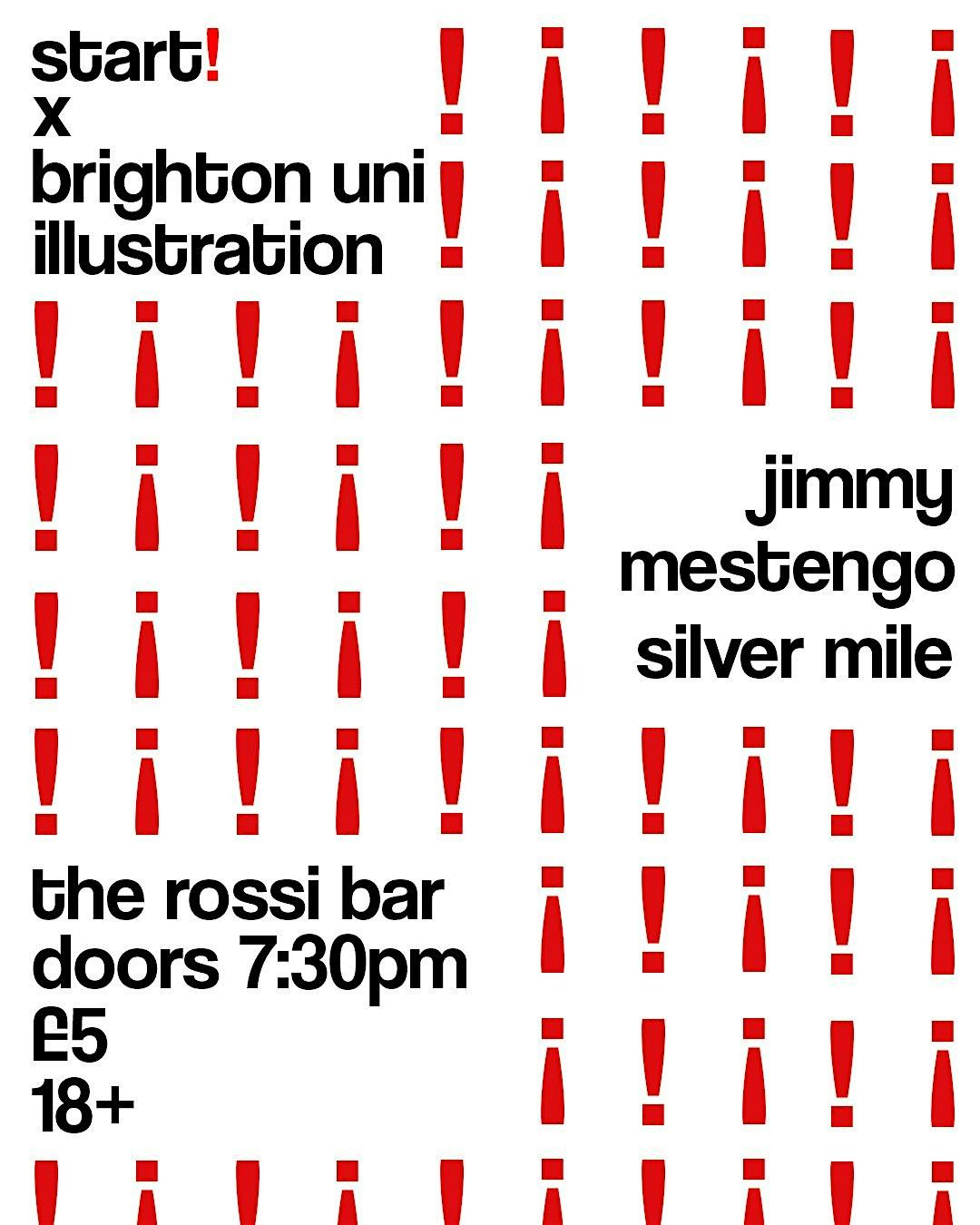 a fundraiser for Brighton university's third year illustration course who are raising funds for their external London graduate show. all money raised goes towards their fundrasing, featuring bands Jimmy, mestengo and Silver Mile