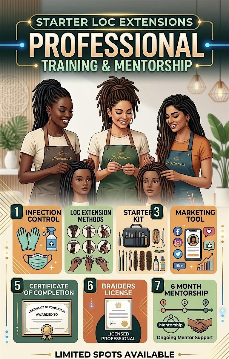Are you ready to transition from a braider to a specialized Loc Extension Artist? This comprehensive masterclass covers everything from technical precision to business longevity. Join us for a hands-on experience designed to turn your passion into a high-ticket career.