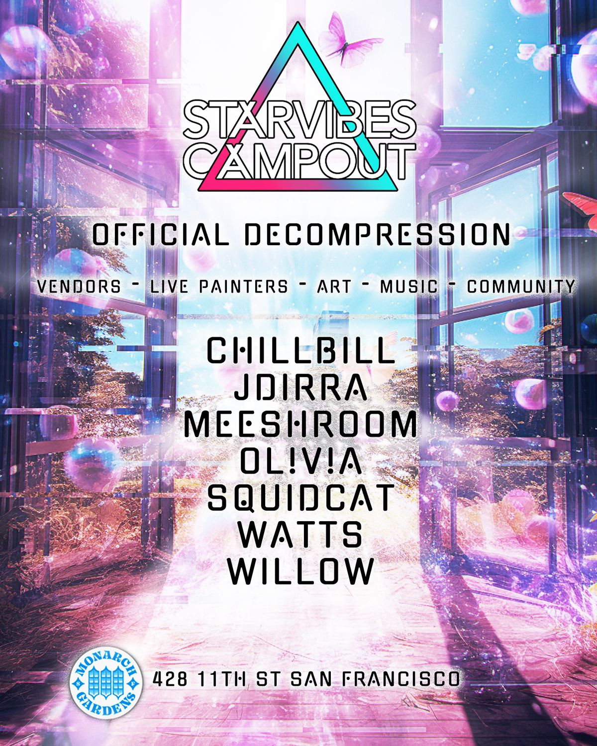 It’s decompression time! We are excited to announce we will be getting the fam back together on Sunday August 13th at @monarchgardens_sf for a day of the best vibes around. House, Bass, and Techno! We will have our epic Live painters and craft vendors on deck as well!! So stoked to see you all soon!