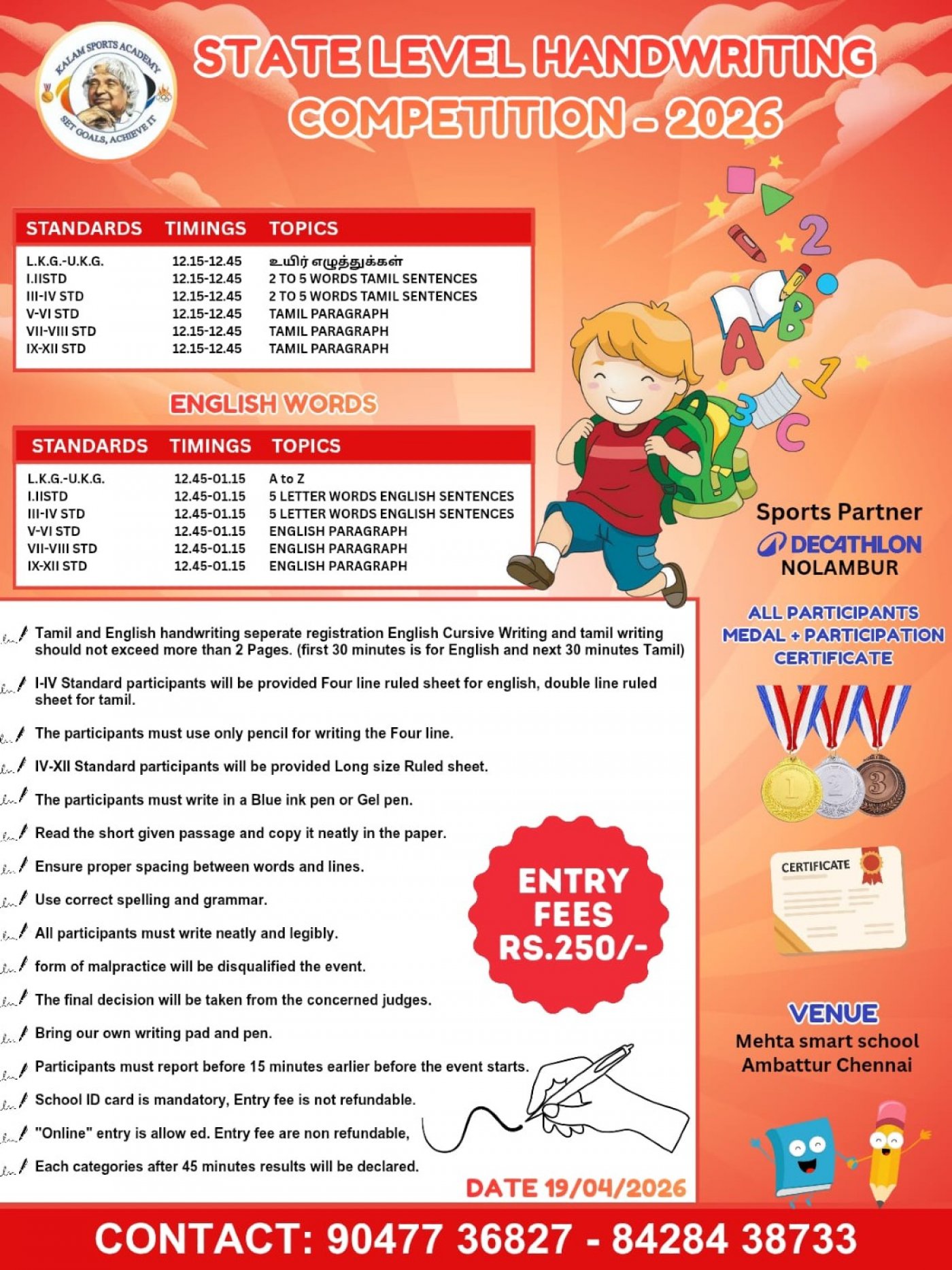 Kalam Event Management presents State Level Handwriting Competition Apr 2026 held on 19th Apr at Dr. Metha's International Smart School, Vanagaram (Backside Decathlon, Nolambur)