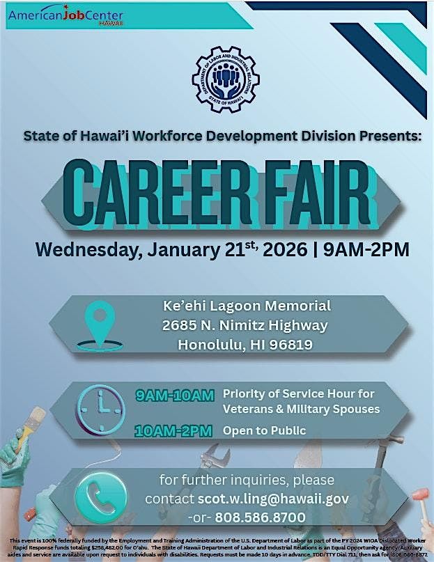The Hawaiʻi State Department of Labor and Industrial Relations (DLIR) will host an in-person career fair on Wednesday, January 21st, 2026 from 9 a.m. to 2 p.m. at Keʻehi Lagoon Memorial, located at 2685 North Nimitz Highway. This event is designed to connect job seekers directly with hiring employers from a wide range of industries across the state.