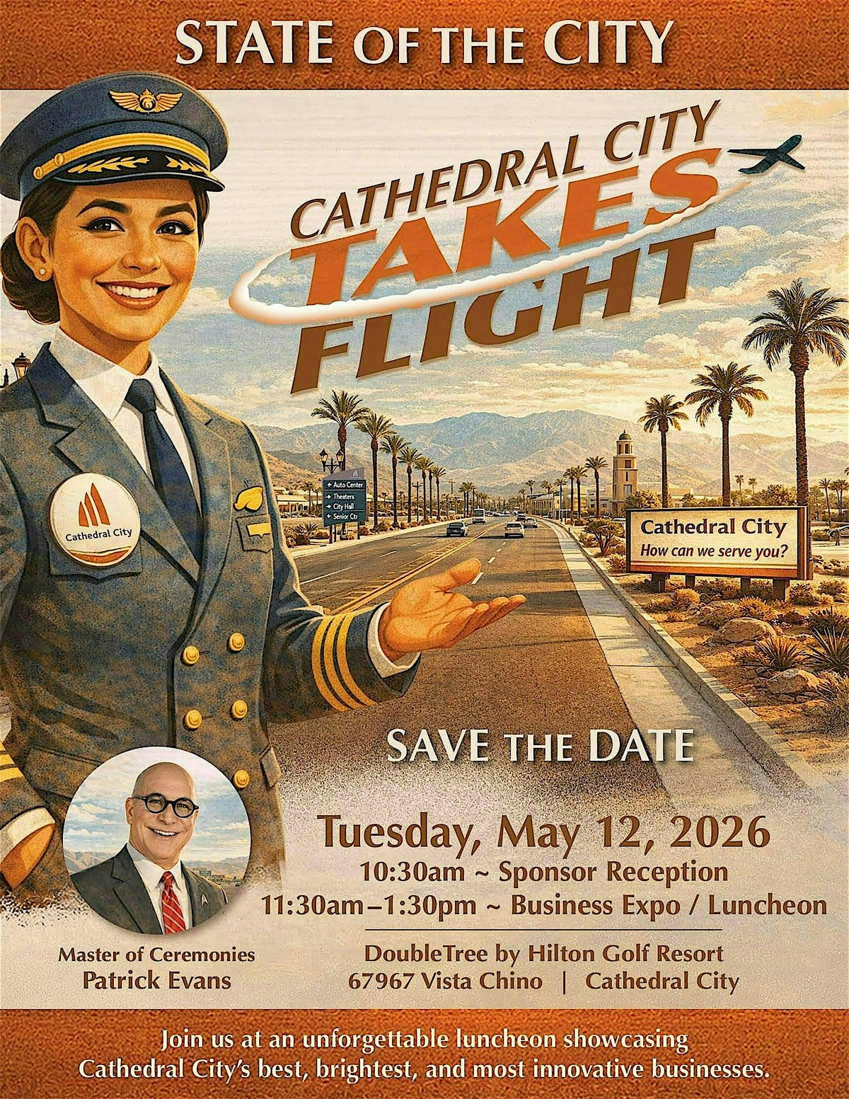 Join Mayor Raymond Gregory and the City Council for the annual State of the City luncheon, themed Cathedral City Takes Flight. Hosted by Emmy Award-winning KESQ Chief Meteorologist and valley favorite Patrick Evans, this year’s event — produced by Hocker Productions — features a business expo, awards ceremony, and the Mayor’s address showcasing Cathedral City’s best, brightest, and most innovative businesses.