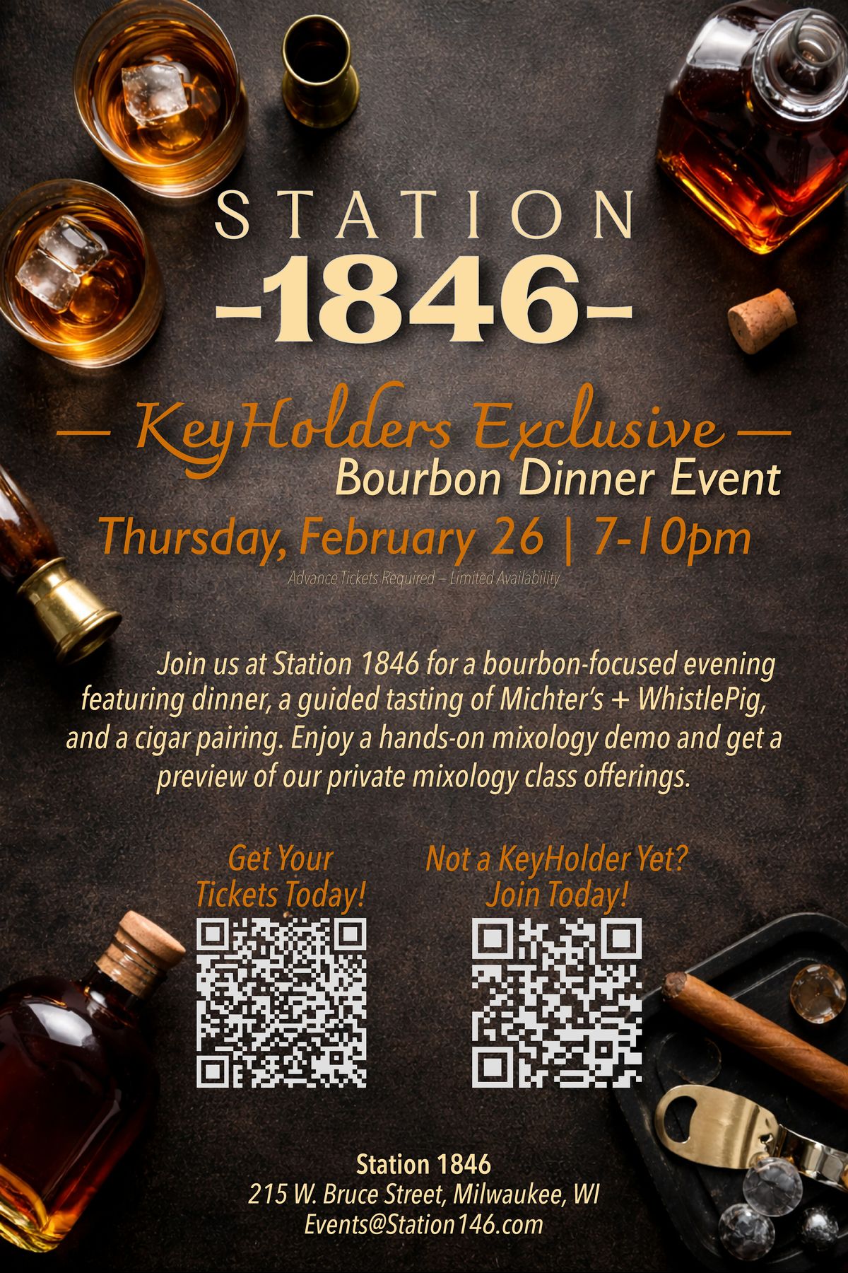 KeyHolders, join us for an exclusive bourbon-focused evening at Station 1846 featuring dinner, bourbon tasting, and cigar pairing.About this Event