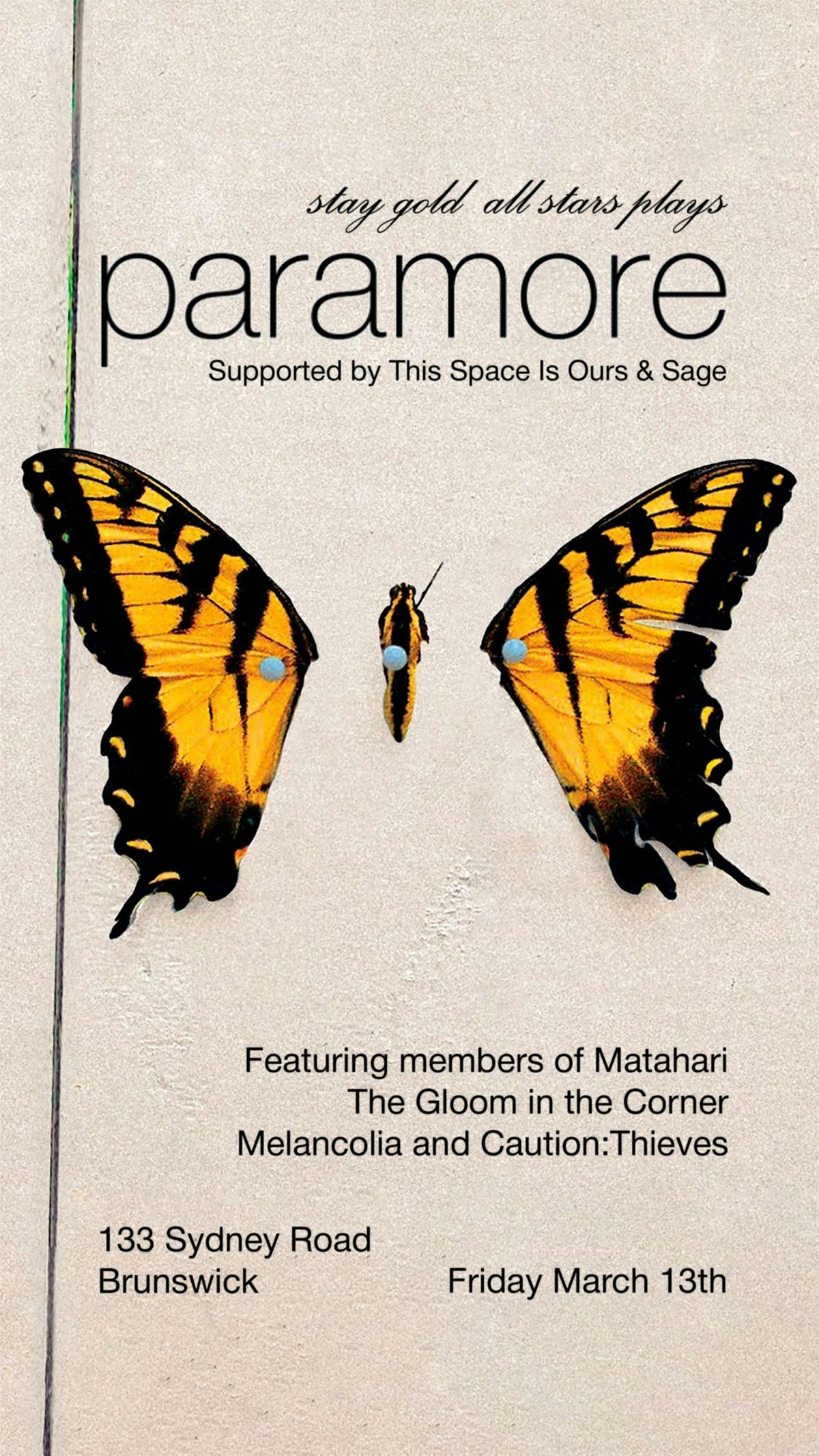 Members of Matahari, The Gloom In The Corner, Melancolia and Caution:Thieves are teaming up to play the best of Paramore for one night only with support from This Space Is Ours and Sage.
