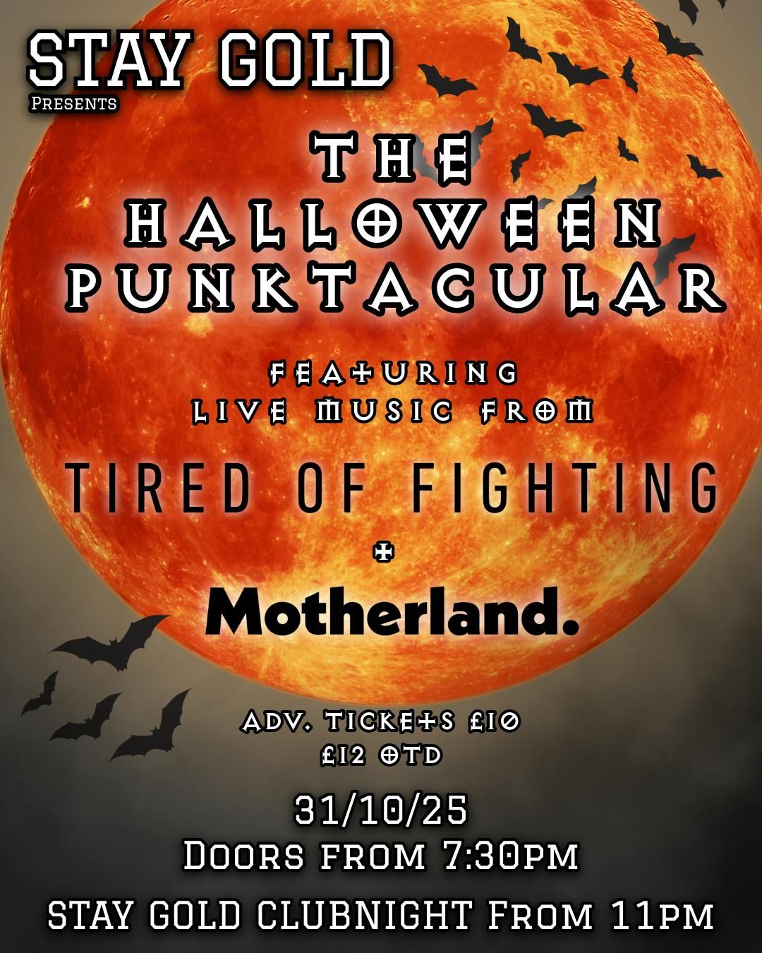 Stay Gold falls on Halloween so we have enlisted the Emo Punk outfit TIRED OF FIGHTING and the Alt Rock jams of MOTHERLAND for a Halloween live music event before our usual club night.Disclaimer: