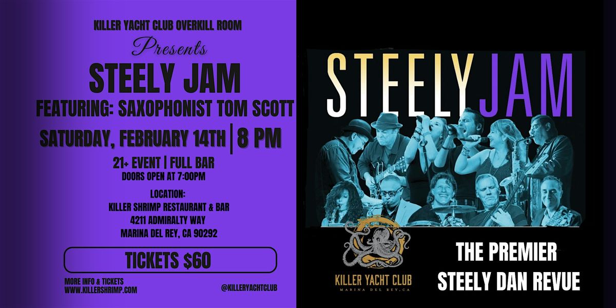 Located at 4211 Admiralty Way, inside of the famous Killer Shrimp Restaurant and Bar. Indulge in fantastic acoustics, craft cocktails, exclusive liquors, and breathtaking waterfront views. The event can become a "dinner and a show" experience by enjoying the delicious meal choices offered at Killer Shrimp, located in the same building, before the performance. This is an "in the know" event hidden from the publics eye so make sure to ask for Yacht Club Overkill Room by name when seeking directions upon arrival to the venue. For more info, visit https://steelyjam.band