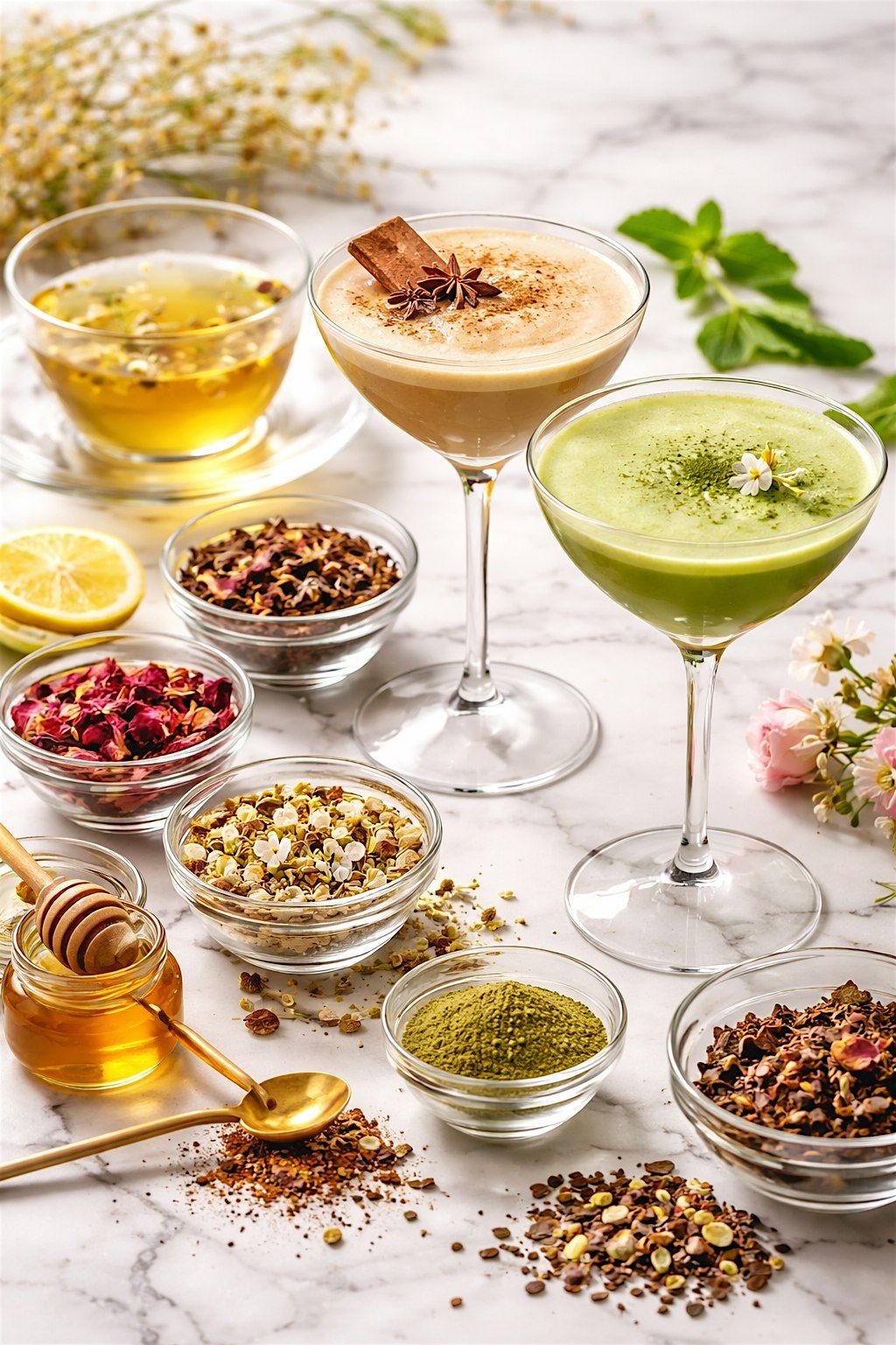 • A Tea Tini flight showcasing herbal, chai, and matcha-infused creations.