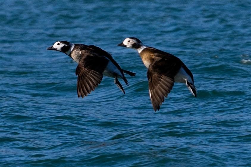photo of two female Long-tailed Ducks in flight by RB Goldman