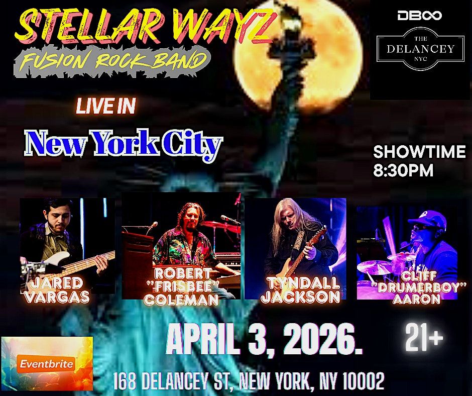 Get ready for an unforgettable night with STELLAR WAYZ performing live in the heart of NYC! This is your chance to vibe with amazing Fusion Rock and a killer atmosphere in person. Grab your crew, bring your energy, and experience what dynamic musicianshiop is first hand and a show you'll be talking about for ages. See you there!