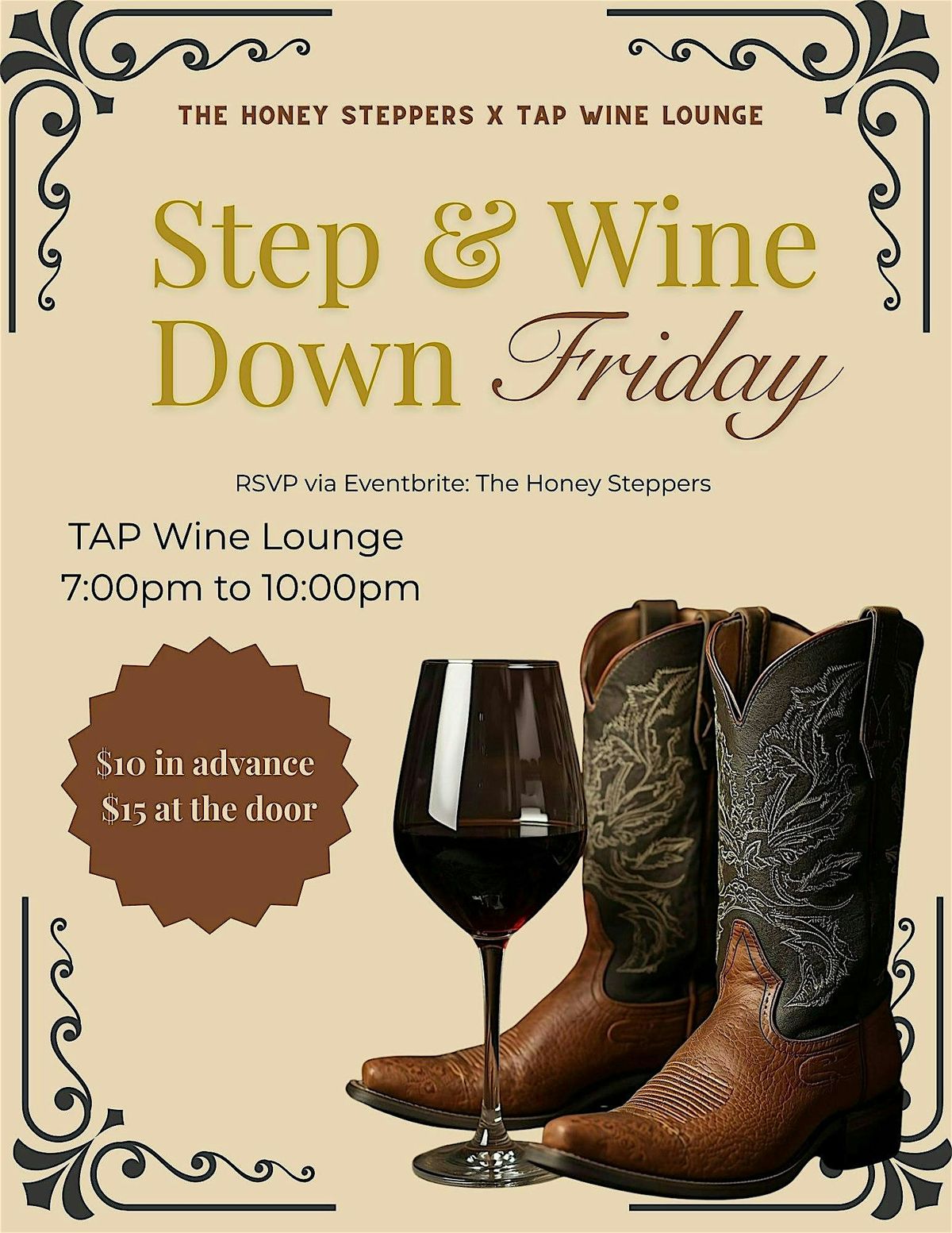 Step Wind Down Fridays is the perfect way to relax, connect, and move at the end of the week. Hosted by the Honey Steppers, this feel-good experience blends smooth vibes, great music, and easy-to-follow instruction as you learn the hottest urban and trail ride line dances. Whether you’re a beginner or a seasoned stepper, you’ll enjoy a welcoming atmosphere designed for fun, stress relief, and community. Sip on a glass of wine, unwind from the week, and step into your Friday night the right way—good energy, good people, and good moves.