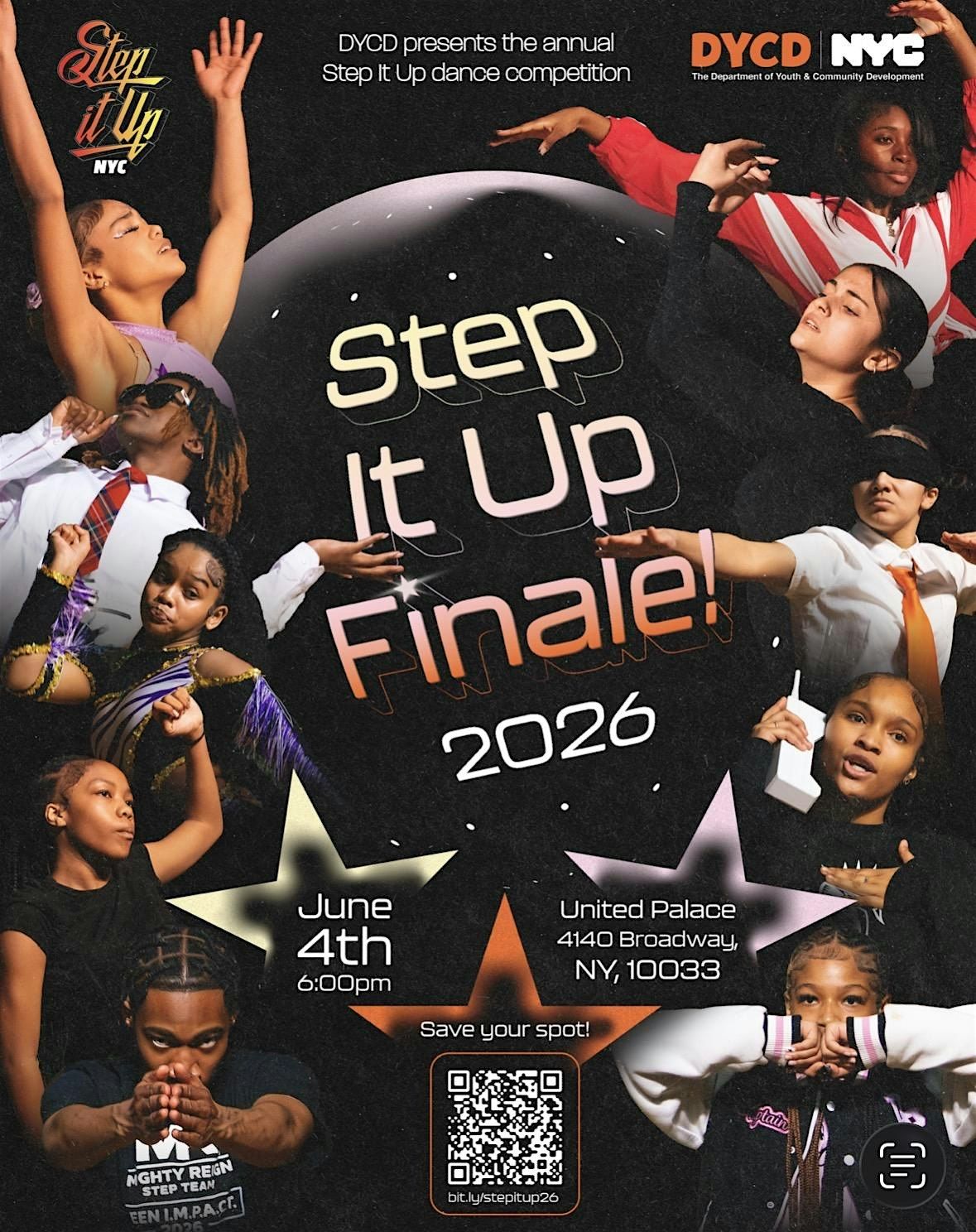We welcome you to our Step It Up Final Showcase to be held at the United Palace Thater on June 4th, 2026! The top 10 finalist teams will be performing and competing for our grand prizes. This is an event hosted by the Department of Youth and Community Development.
