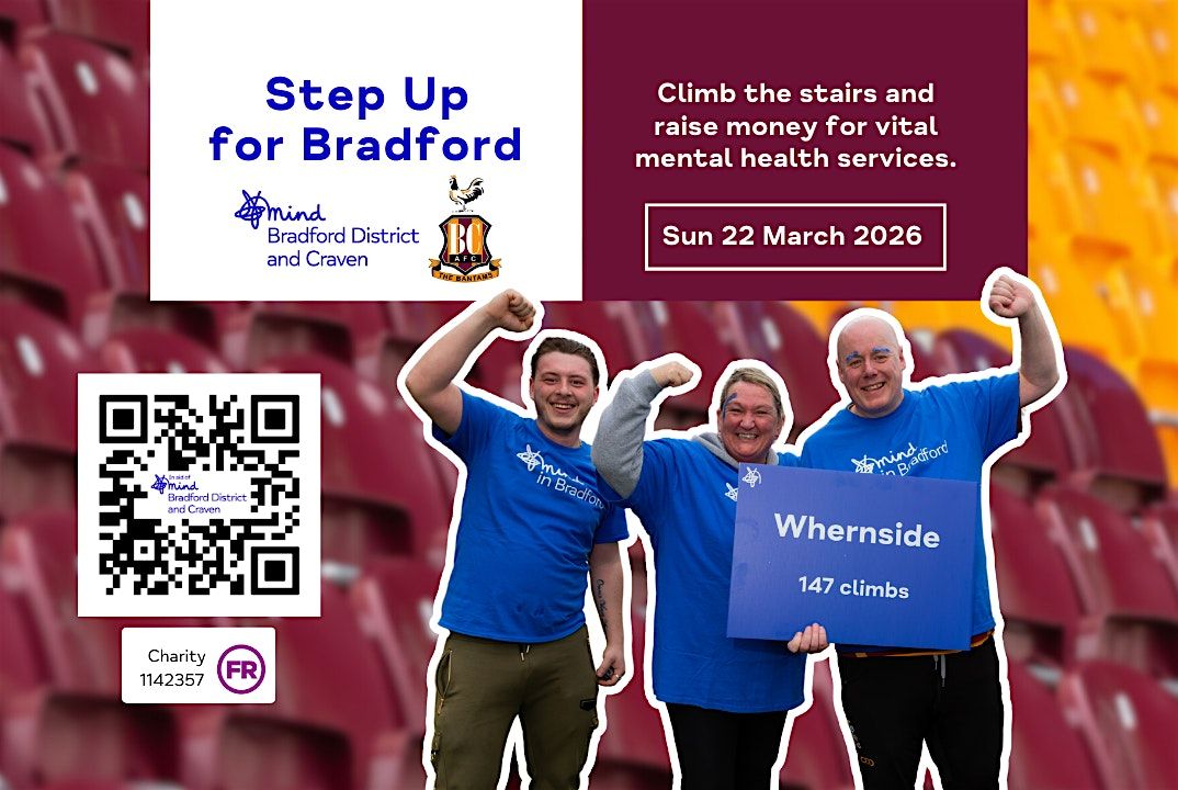 As the official mental health partner of Bradford City AFC, Bradford District and Craven Mind invites you to the heart of the action at the University of Bradford Stadium for a one-of-a-kind step-climbing challenge.
