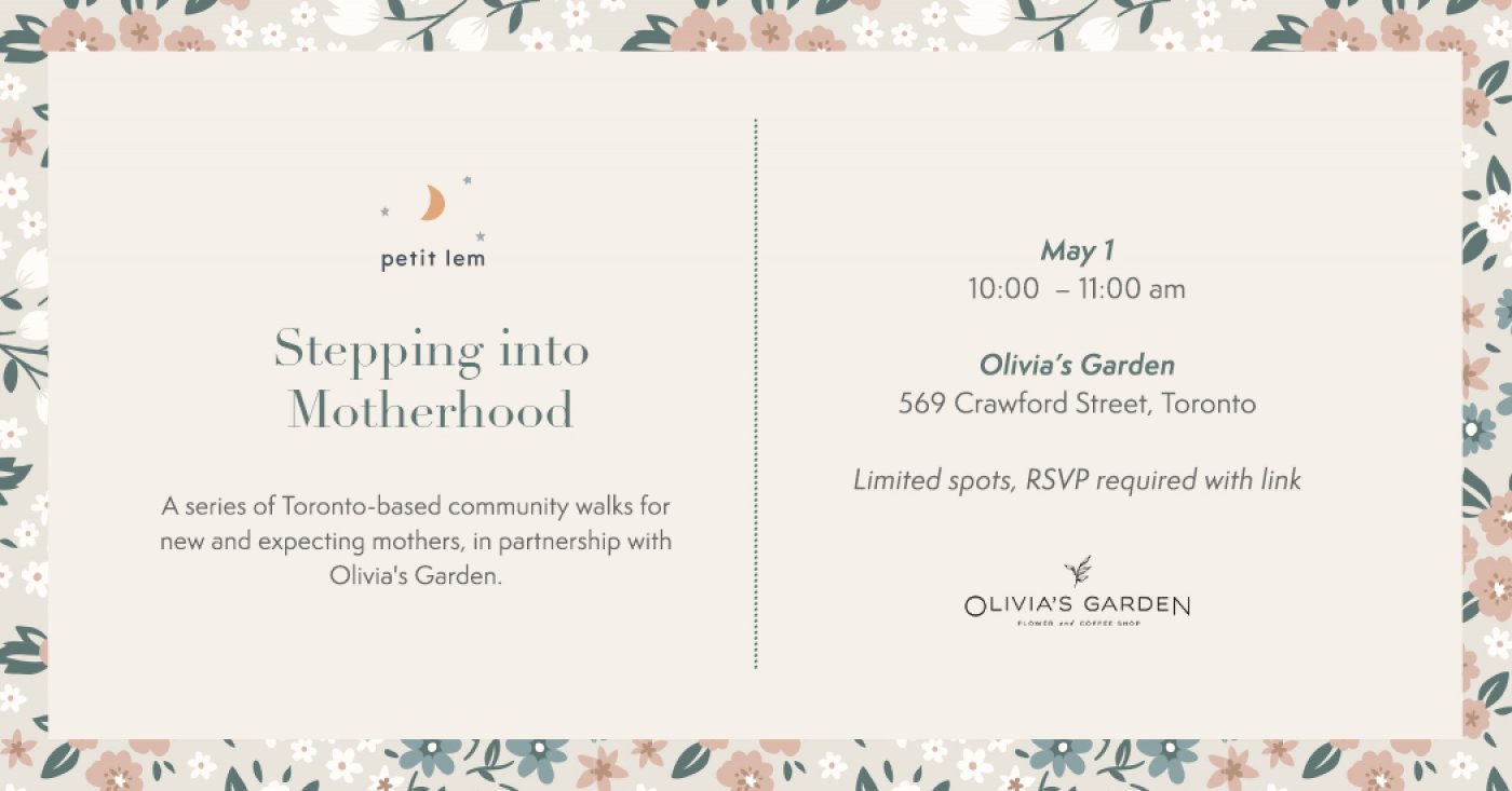In partnership with Olivia’s Garden, new and expecting mothers are invited to come together for a gentle spring walk starting and ending at the café. Guests will enjoy coffee and pastries, connect with each other, and browse Petit Lem’s new Maman & Mini collection.