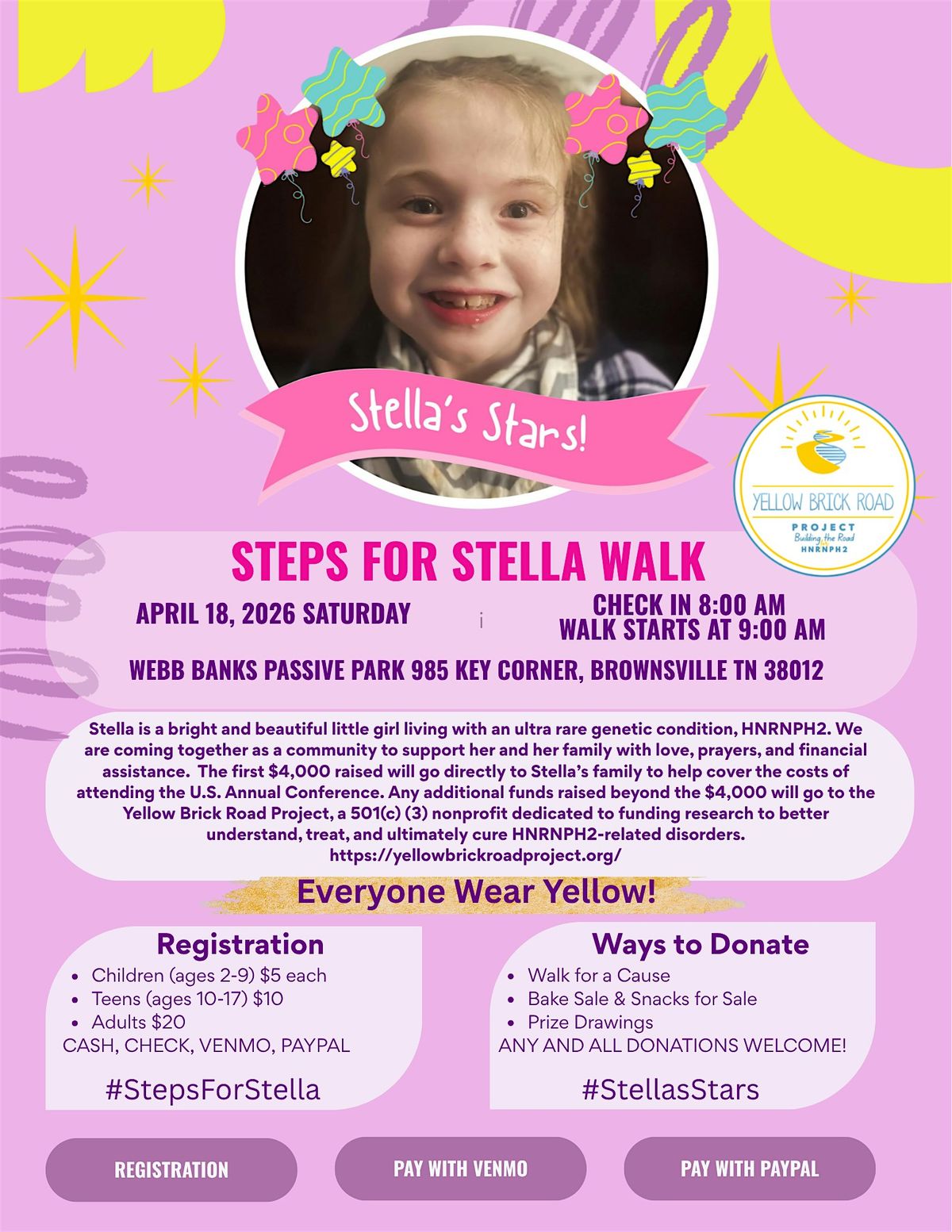 Stella is a bright and beautiful little girl living with an ultra rare genetic condition, HNRNPH2. We are coming together as a community to support her and her family with love, prayers, and financial assistance. The first $4,000 raised will go directly to Stella’s family to help cover the costs of attending the U.S. Annual Conference. Any additional funds raised beyond the $4,000 will go to the Yellow Brick Road Project, a 501(c) (3) nonprofit dedicated to funding research to better understand, treat, and ultimately cure HNRNPH2-related disorders. https://yellowbrickroadproject.org/