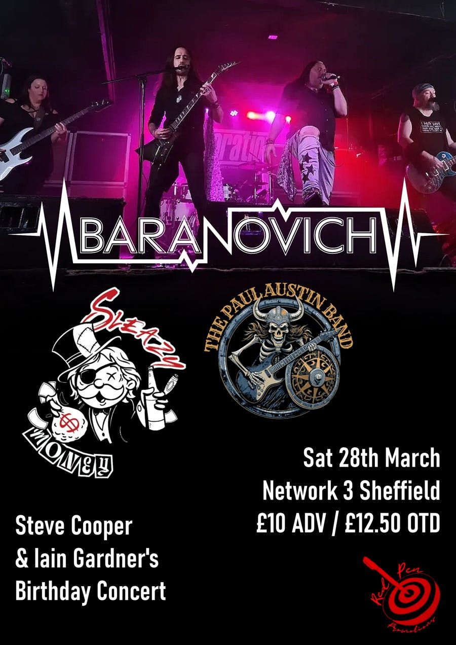 Steve & Iain welcome you all to celebrate their birthdays with the following 3 bands performing:Baranovich:Sheffield based band bringing a new wave of classic rock.Catchy, anthemic choruses with hard hitting riffs.Sleazy Money:Your mother's favorite rock'n'roll band 💋 FAST AND FILTHY 💋Loud, reckless, and unapologetically wild, Sleazy Money is a 4-Piece, Hard Rock Outfit from the streets of Merthyr Tydfil, South Wales, fusing raw energy with larger-than-life attitude. Formed in 2024, the band is a high-octane mix of heavy riffs, sleazy hooks, and anthemic choruses that demand to be played at full volume.Taking inspiration from the raw excess of ‘80’s rock and the rising glam-metal scene of the Sunset Strip, Sleazy Money’s live performances are a spectacle of sweat, energy, and chaos. Known for their rowdy, no-holds-barred attitude both on and off stage, they thrive on pushing boundaries and delivering a show that’s as unpredictable as it is electrifying.The Paul Austin Band: A dynamic rock band known for its powerful performances and captivating sound. With a blend of classic rock influences and modern rock sensibilities, they have carved out a unique space in the music scene.