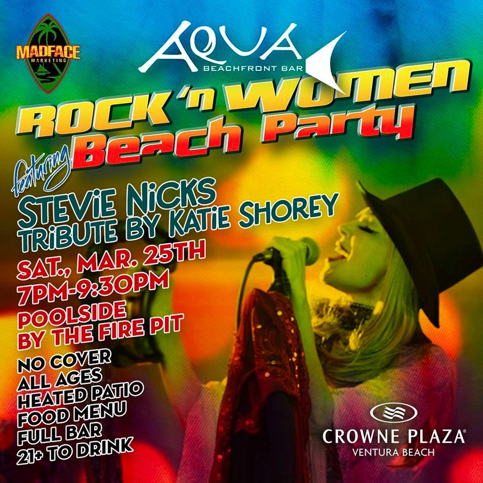 Rock 'n Women Beach Party! Katie Shorey performs her stunning tribute to Stevie Nicks & Fleetwood Mac on the Aqua Lounge heated patio, poolside by the fire pit! NO COVER, all ages, food & bar on site. Self parking at the hotel, Aqua Lounge will validate your ticket. Come dance with us and bring your friends!Presented by Mad Face Marketing & Promotions
