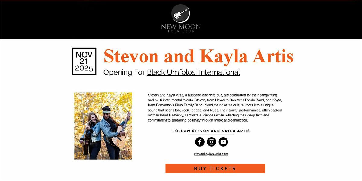 Stevon and Kayla Artis, a husband-and-wife duo, are celebrated for their songwriting and multi-instrumental talents. Stevon, from Hawai'i’s Ron Artis Family Band, and Kayla, from Edmonton’s Kimo Family Band, blend their diverse cultural roots into a unique sound that spans folk, rock, reggae, and blues. Their soulful performances, often backed by their band Heavenly, captivate audiences while reflecting their deep faith and commitment to spreading positivity through music and connection.
