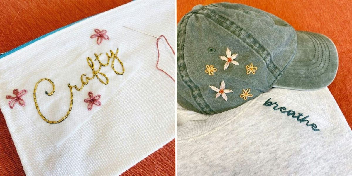 Guests will choose from a sheet of small designs or request a custom word or name that we’ll print for you. You can learn and practice embroidery stitches during the session or jump straight into stitching your chosen design.