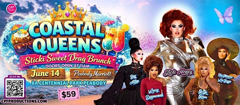 CPFProductions with Sticki Honey Presents Sticki Sweet Coastal Queens Drag Brunch at The Peabody Marriott for a special afternoon of Drinks, Drag and Drama! This is our Summer Edition Show!