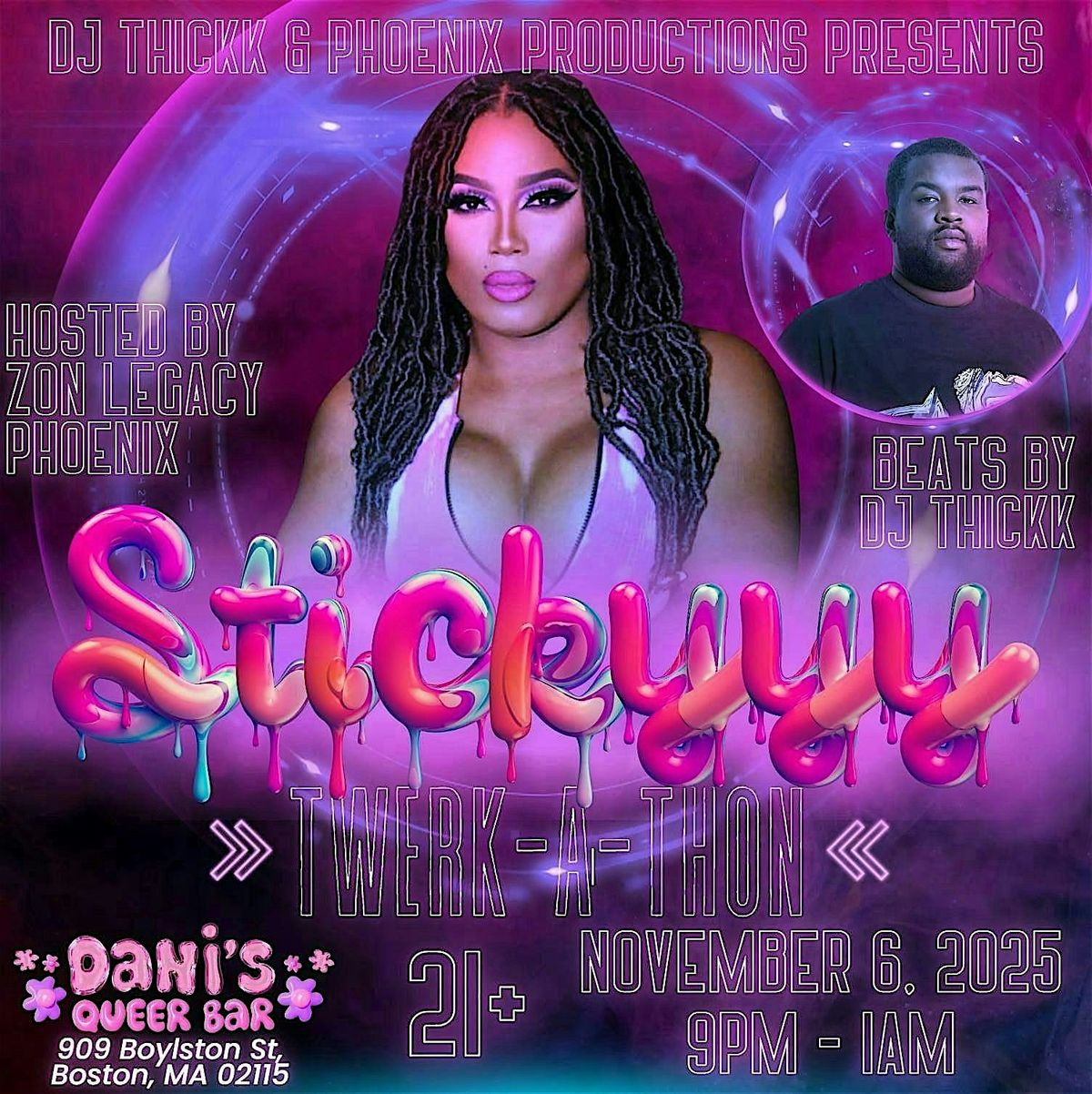 Come join us for a night of fun at Dani’s Queer Bar! Get ready to dance, mingle, and have a blast at Boston's TwerkFest of the year. Whether you're a seasoned twerker or just looking for a good time, Stickyyy is the place to be. Don't miss out on the sticky vibes and amazing energy - mark your calendars now!