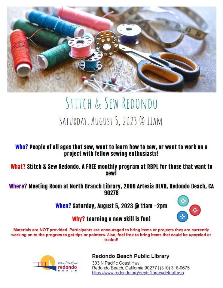 Who? People of all ages that sew, want to learn how to sew, or want to work on a project with fellow sewing enthusiasts!What? Stitch & Sew Redondo. A FREE monthly program at RBPL for those that want to sew!