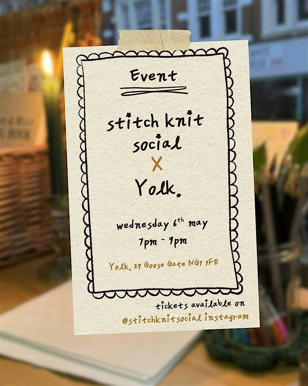 Following the success of our launch, we are excited to announce our next event and can’t wait to welcome even more of you to Stitch Knit Social. Join us at Yolk. Nottingham on Wednesday 6th May frpm 7pm - 9pm.